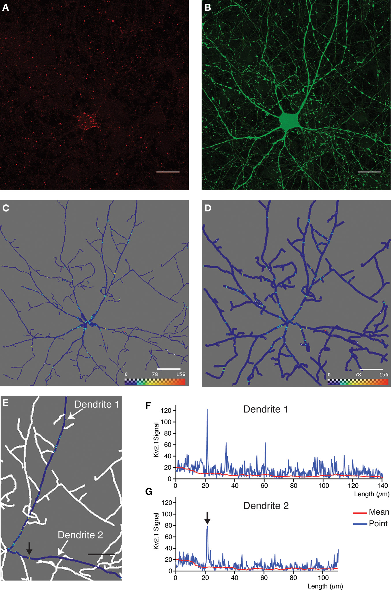 Quantitative analysis and 3D profiling of endogenous Kv2.1 signal in cultured neocortical neurons. (A,B) Image stacks corresponding to endogenous Kv2.1 signal (A) and morphological label (eGFP expression) (B). Images are z-projections derived from maximum signal intensity across 36 focal planes generated from data that has been subjected to 2 rounds of blind deconvolution. (C) Two-dimensional snapshot taken from Amira viewer window showing neuronal reconstruction overlaid with 3D ion channel profile derived from point fluorescence values calculated along the dendrite skeleton. The color map has been adjusted to best represent, on a graphical level, the predominant ion channel clusters. Scale bar: 20 μm. In this case, the skeleton is represented as a true morphological skeleton (incorporating information about the radius of the dendrite). (D) Two-dimensional snapshot taken from Amira viewer window (same dataset as in C) showing reconstructed skeleton (represented as a filament). (E) Magnification of a section of the reconstructed skeleton, showing 3D ion channel profile associated with two individual dendrites (arbitrarily named dendrite 1 and dendrite 2). Here, point fluorescence's values are presented by means of the color map function. The color map has been adjusted to best represent, on a graphical level, the predominant ion channel clusters. (F,G) Fluorescence intensity plotted as a function of dendritic length for the same dendrites. Data is presented as the point fluorescent value as well as mean fluorescent value calculated at each point. Arrows in (E) and (G) indicate a putative ion channel cluster, clearly visible in both representations of the data. Scale bar, 20 μm.