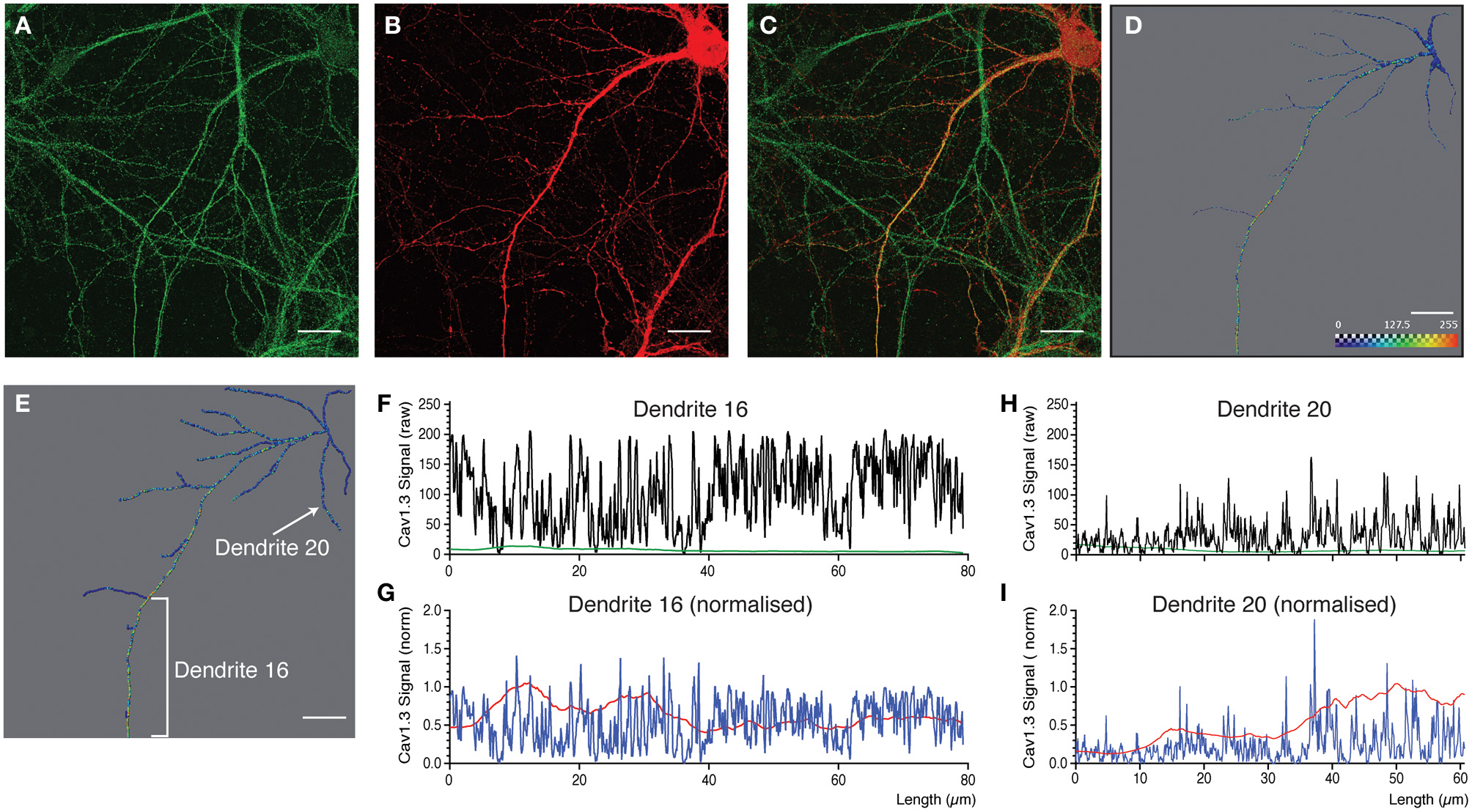 Quantitative analysis and 3D profiling of endogenous Cav1.3 signal in cultured neocortical neurons. (A,B) Image stacks corresponding to endogenous Cav1.3 signal (A) and morphological label (mCherry expression) (B). (C) Overlay of images in (A and B). Images are z-projections derived from maximum signal intensity across 24 focal planes. (D,E) Amira images showing reconstructed dendritic skeleton overlaid with 3D ion channel profile derived from point fluorescence values calculated along the dendrite skeleton. (D) Morphological skeleton with dendritic dimensions representing the radius of the true dendrite structure. (E) Filament map. (F,G,H,I) Fluorescent intensity plots for two selected dendrites (indicated in panel E). Data is presented as the point fluorescent value and mean fluorescent value calculated at each point. (F,H) Raw data. (G,I) Data normalized to fluorescent intensity data obtained from applying the same analysis to the morphological label. Scale bar, 20 μm.