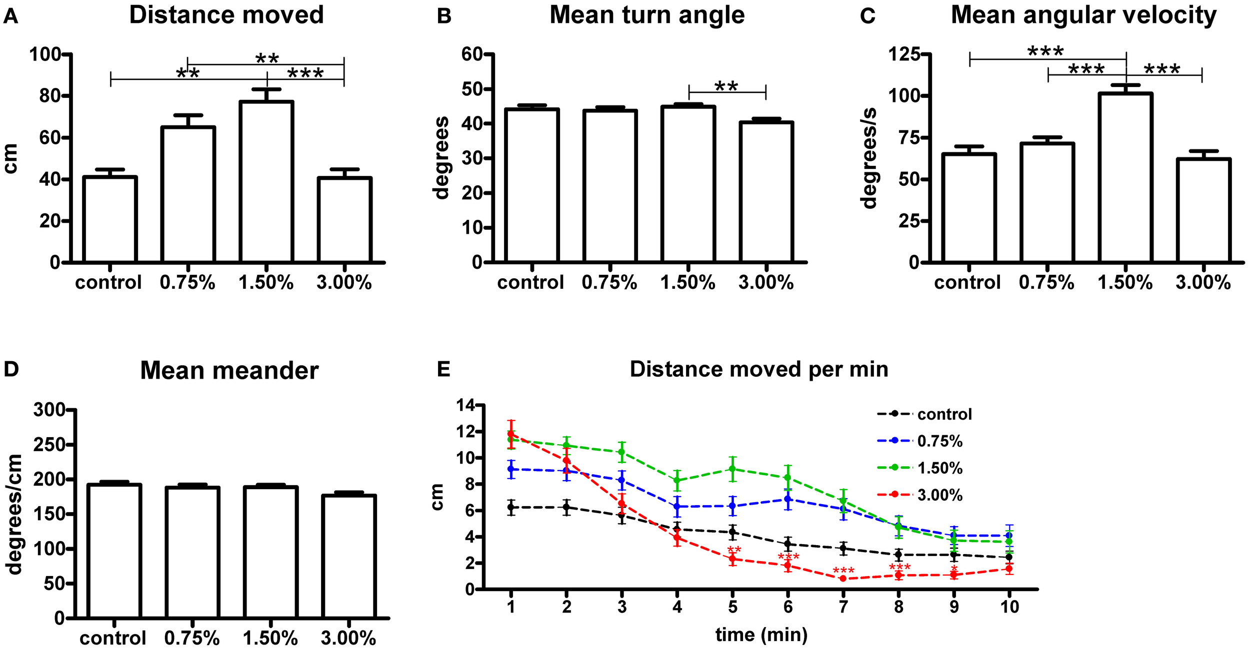 The effect of 0.75%, 1.50% and 3.00% ethanol concentration on locomotion in larval zebrafish during the first 10 minutes after exposure. A significant increase can be seen in the total distance moved (A) up to a 1.50% concentration, with a 3.00% concentration having no apparent change on total distance moved [F(3, 213) = 8.304, p < 0.0001]. The angular velocity (C) is also significantly altered in the 1.50% group [F(3, 213) = 16.18, p < 0.0001]. We could also see a significant difference in turn angle (B) between the 1.50% and 3.00% groups, but this observation was inconsistent across repeats and therefore unlikely to be of any relevance [F(3, 213) = 4.046, p = 0.0080]. No differences are seen in meander (D) [F(3, 213) = 2.331, p = 0.0753]. Statistics were done using 1-way ANOVA followed by Tukey's post-hoc test, *p < 0.05, **p < 0.01, ***p < 0.001. When plotting the data as total distance moved per minute (E), the initial stimulatory effect of the 3.00% concentration can clearly be seen. Both time [F(9, 1917) = 89.02, p < 0.0001] and treatment concentration [F(3, 213) = 5.865, p = 0.0007] had extremely significant effects on the total distance moved. There was also significant interaction between the time and treatment concentration [F(27, 1917) = 4.396, p < 0.0001], but this is mostly attributable to the strong biphasic effect observed for the 3.00% group. Statistics were done using 2-way repeated measures ANOVA followed by Bonferroni's post-hoc test. The numbers of larvae in each group were as follows: control: N = 47, 0.75%: N = 56, 1.50%: N = 61, 3.00%: N = 53.