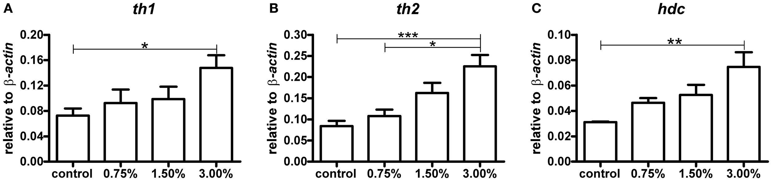 The levels of th1, th2, and hdc mRNA after a 10-min ethanol treatment. A clear dose-dependent trend can be seen for all mRNA species analysed. Statistical significance was analysed using One-Way ANOVA followed by Tukey's post-hoc test. (A)F(3, 17) = 3.439, P = 0.0405; (B)F(3, 17) = 8.489, P = 0.0011; (C)F(3, 17) = 5.515, P = 0.0079, *p < 0.05, **p < 0.01, ***p < 0.001 according to the post-hoc test. N = 6 except for the 0.75% group, for which N = 3.