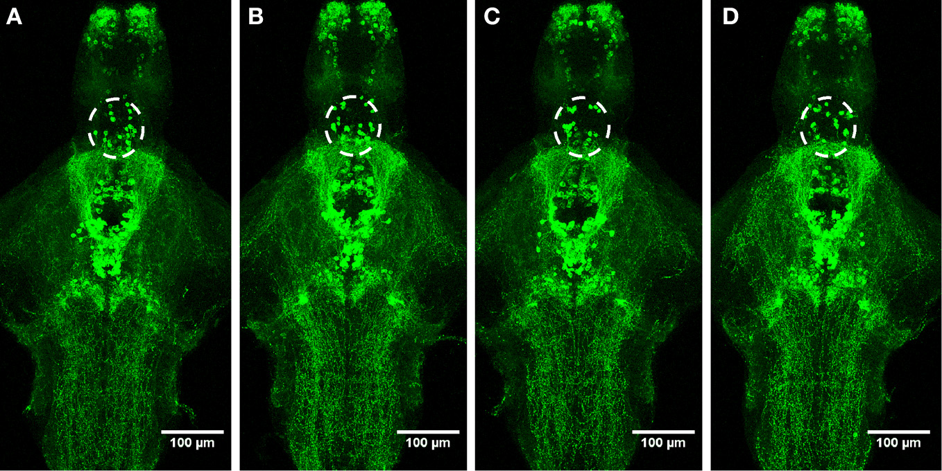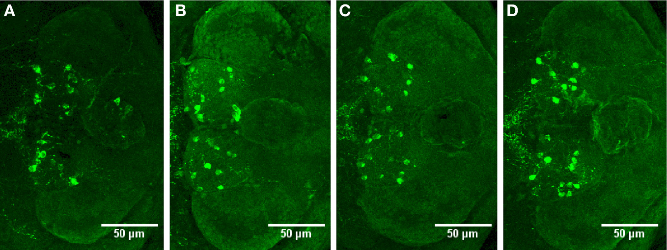 Distribution of histamine-immunoreactive cells after a 10-min ethanol treatment. (A) Control, (B) 0.75% ethanol, (C) 1.50% ethanol, (D) 3.00% ethanol. No changes are seen between the groups, which are further confirmed by cell counting statistics in Figure 4. N = 13–15 larvae per treatment group.