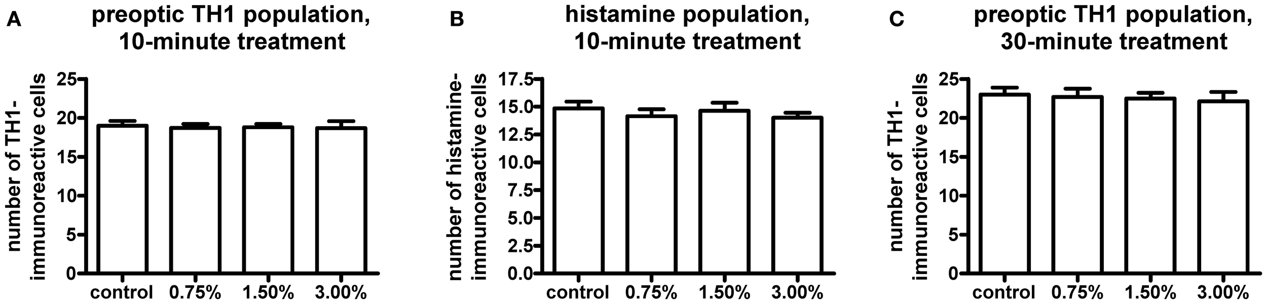 We observed no change in the expression pattern of th1, th2, and hdc by in situ hybridization in any of the groups after a 10-min treatment (data not shown). These results were supported by immunohistochemistry, which also showed no changes in distribution patterns of TH1- and histamine-immunoreactive cells and fibers (Figure 3, data not shown for TH1). This was verified by counting the number of histamine- and TH-immunoreactive cells in the hypothalamus and preoptic group [groups 3 and 4 as defined by Sallinen et al. (2009b)], respectively. No change in cell numbers was seen (p > 0.05, Figure 4).