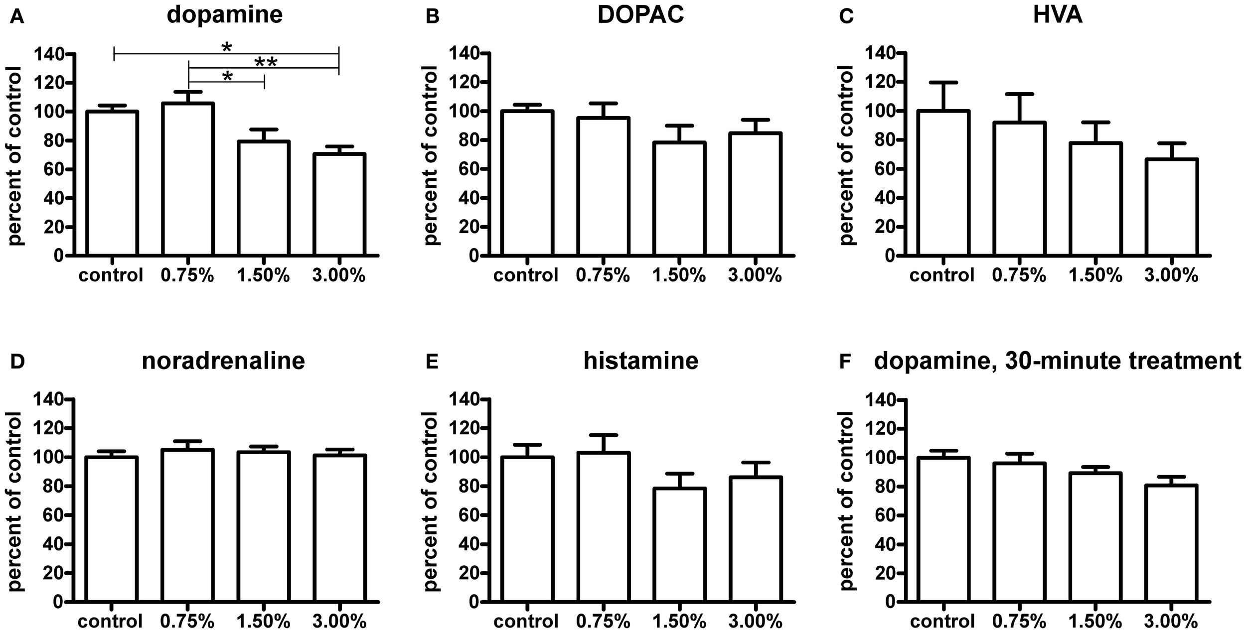 Neurotransmitter levels relative to control group measured by HPLC after a 10-minute ethanol treatment. The dopamine (A) levels were significantly decreased with a 1.50% and 3.00% treatment, whereas a 0.75% does not have any visible effect [F(3, 24) = 6.174, p = 0.0029]. The levels of HVA (C) show a slight non-significant decreasing trend across treatment groups [F(3, 22) = 0.7453, p = 0.5366], while DOPAC (B) levels are unchanged [F(3, 24) = 1.140, p = 0.3531]. Noradrenaline (D) and histamine (E) levels were not significantly affected [noradrenaline: F(3, 24) = 0.2692, p = 0.8470; histamine: F(3, 24) = 1.246, p = 0.3149], but a slight decrease trend of the histamine levels can be seen in the 1.50% and 3.00% groups. After a 30-minute treatment (F), the observed decrease in dopamine levels was smaller and not significant [F(3, 25) = 2.417, p = 0.0901]. Statistical analysis was done using 1-way ANOVA followed by Tukey's post-hoc test. *p < 0.05, **p < 0.01, according to the post-hoc test. N = 7, except for the control group and 3.00% group in the HVA data where N = 6.