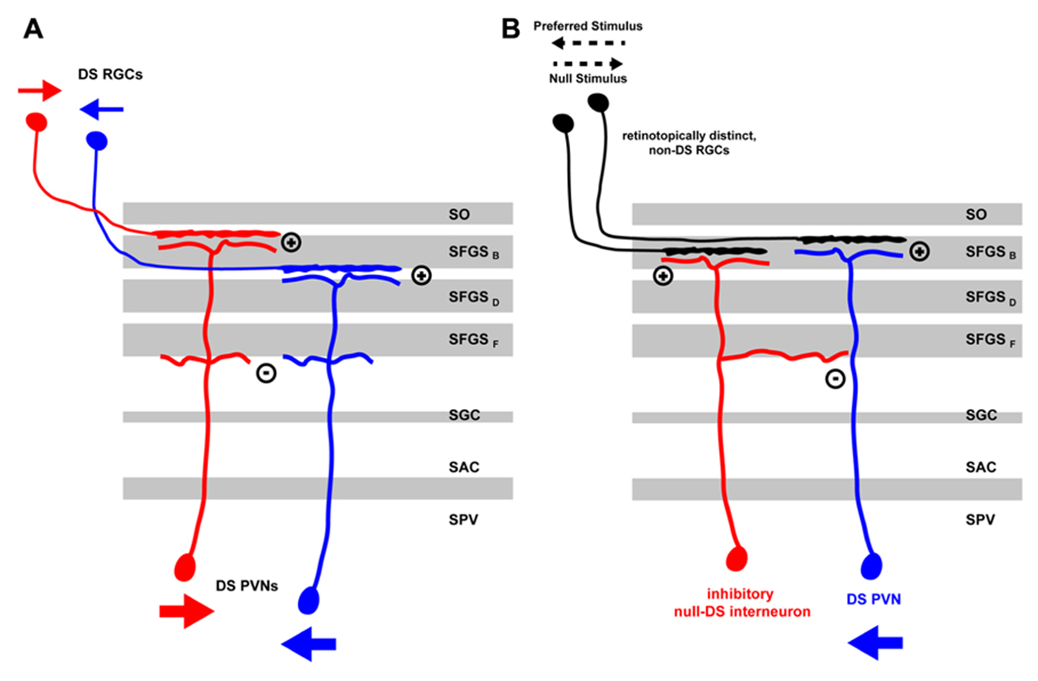 DS neurons are found in several regions along the visual pathway, including retina, tectum, and cortex. It is important to understand how neurons acquire DS characteristics at each of these stages. Studies in zebrafish have revealed that DS is hardwired and can develop independently of patterns of activity. In the tectum, DS retinal inputs terminate in the tectal neuropil in specific laminae, where they form connections with the lamina-restricted dendrites of tectal interneurons. This feed-forward mode of DS wiring is reminiscent of the so-called “labeled lines” that are found in other sensory systems (Kauer and White, 2001). Evidence for the contribution of tectal recurrent connections, especially inhibitory ones, is less clear. If it exists, it might contribute to sharpening the response of DS output neurons.