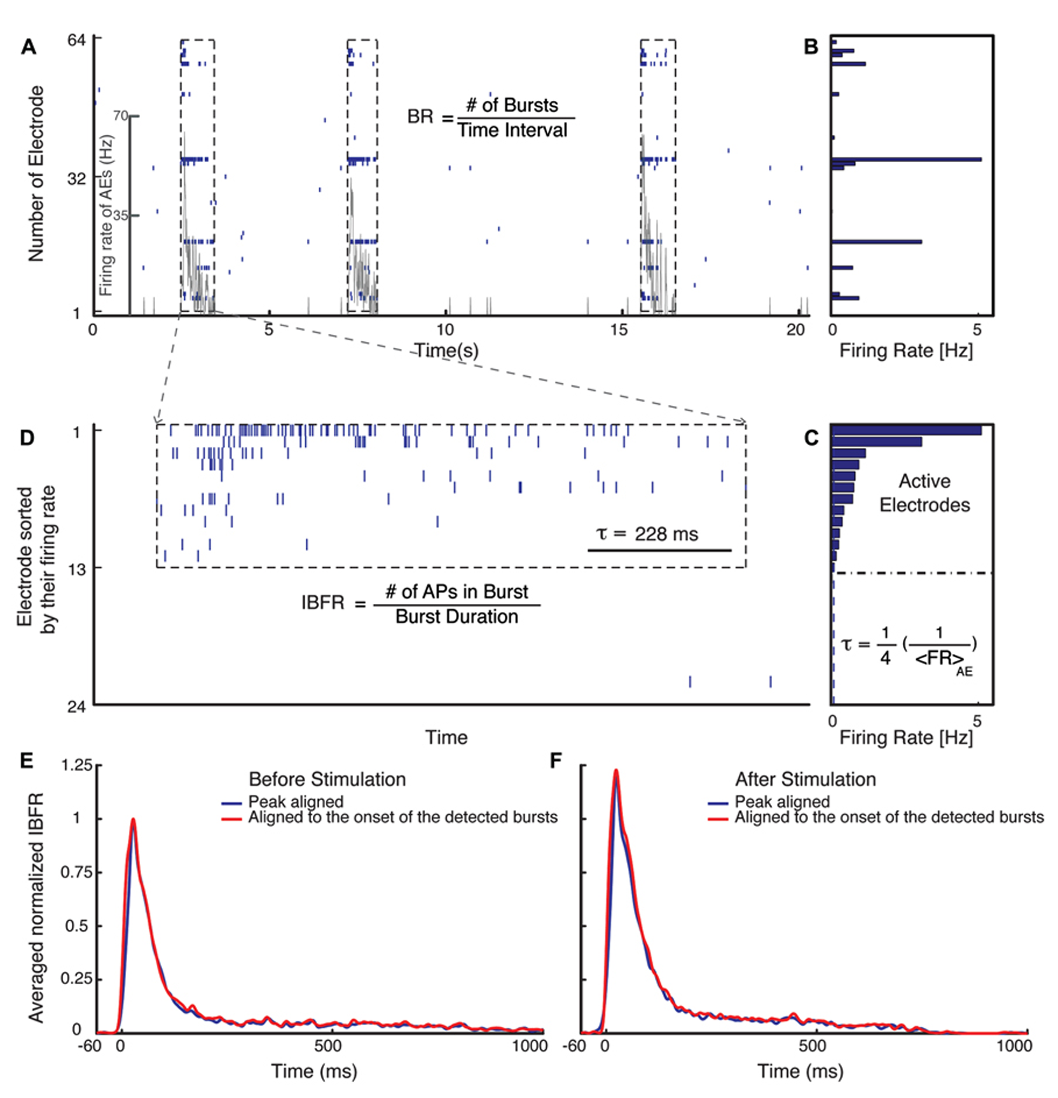 Burst detection algorithm. (A) Typical electrical activity of a culture recorded via all 60 channels and the corresponding FR of AEs (gray line). In (B), the average spontaneous FRs over 300 s of the corresponding electrodes are shown. The graph (C) shows the rank ordered FRs of all electrodes. Selection of the active electrodes (AE), electrodes with average FR larger than 0.1 Hz is illustrated. The threshold for detecting a burst is defined as 1/4 of the inverse average FR of all AE. (D) Raster plot of an example burst. The threshold inter-spike interval (ISI), τ, is marked in (D) for comparison. (E,F) Normalized average IBFR of one experiment with fade-in stimulation before and after stimulus (normalized to the peak of average IBFR before stimulus). The red line shows the average IBFR by aligning the bursts by the onset of the detected burst and blue line shows the average IBFR by aligning bursts by their first peak.