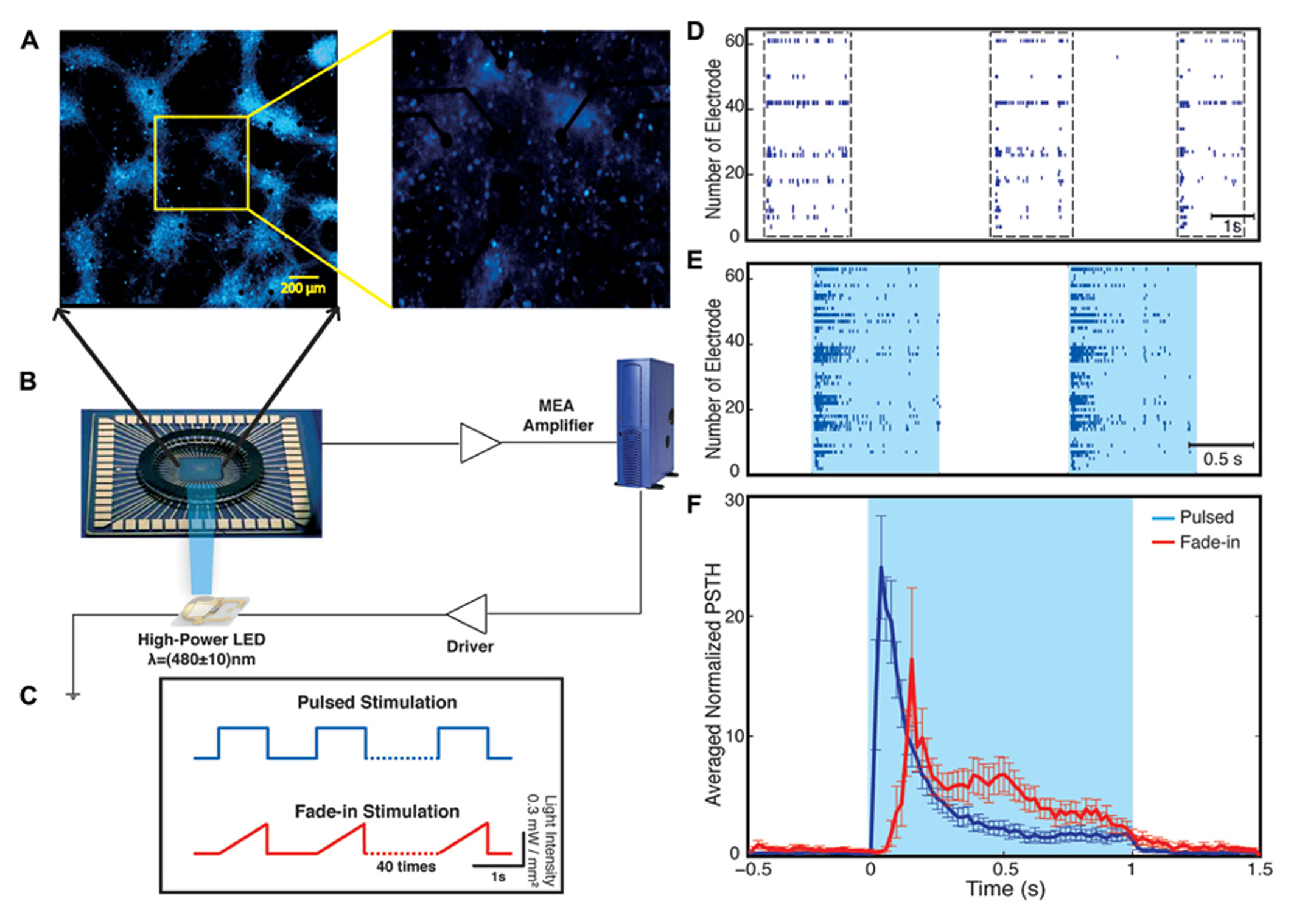 Optical network electrophysiology. Panel (A) shows the experimental setup including channelrhodopsin-2 transduced neurons cultured on a multi-electrode array stimulated by whole-field blue light illumination using a high-power LED (B). The data is acquired by a MEA amplifier and a recording computer. The cultures are stimulated with either pulsed or fade-in stimuli (C). Panel (D) shows a representative raster plot of spontaneous activity in a network before stimulation across all 60 electrodes. Panel (E) presents evoked activity of the network during pulsed blue-light stimulation. The light blue color marks the duration of blue-light stimulation. Panel (F) present the electrode averaged normalized peri-stimulus time histogram (PSTH) for both pulsed (dark blue) and fade-in stimulation (red).