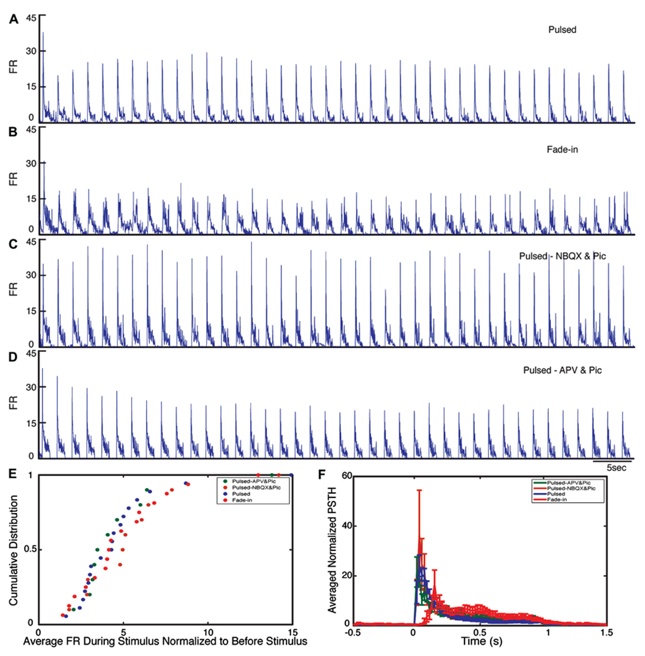 Evoked activity during light stimulation. (A–D) Average normalized firing rate (FR) during each pulse of stimulation (normalized to the average FR before stimulus) for pulsed (n = 18 experiments), fade-in (n = 16 experiments), pulsed stimulation on cultures with presence of NBQX/Picrotoxin (n = 10 experiments), and pulsed stimulation on cultures with presence of APV/Picrotoxin (n = 10 experiments). (E) Cumulative distribution of average FR during stimulus normalized to average FR before stimulus. (F) Average normalized PSTH over all experiments.
