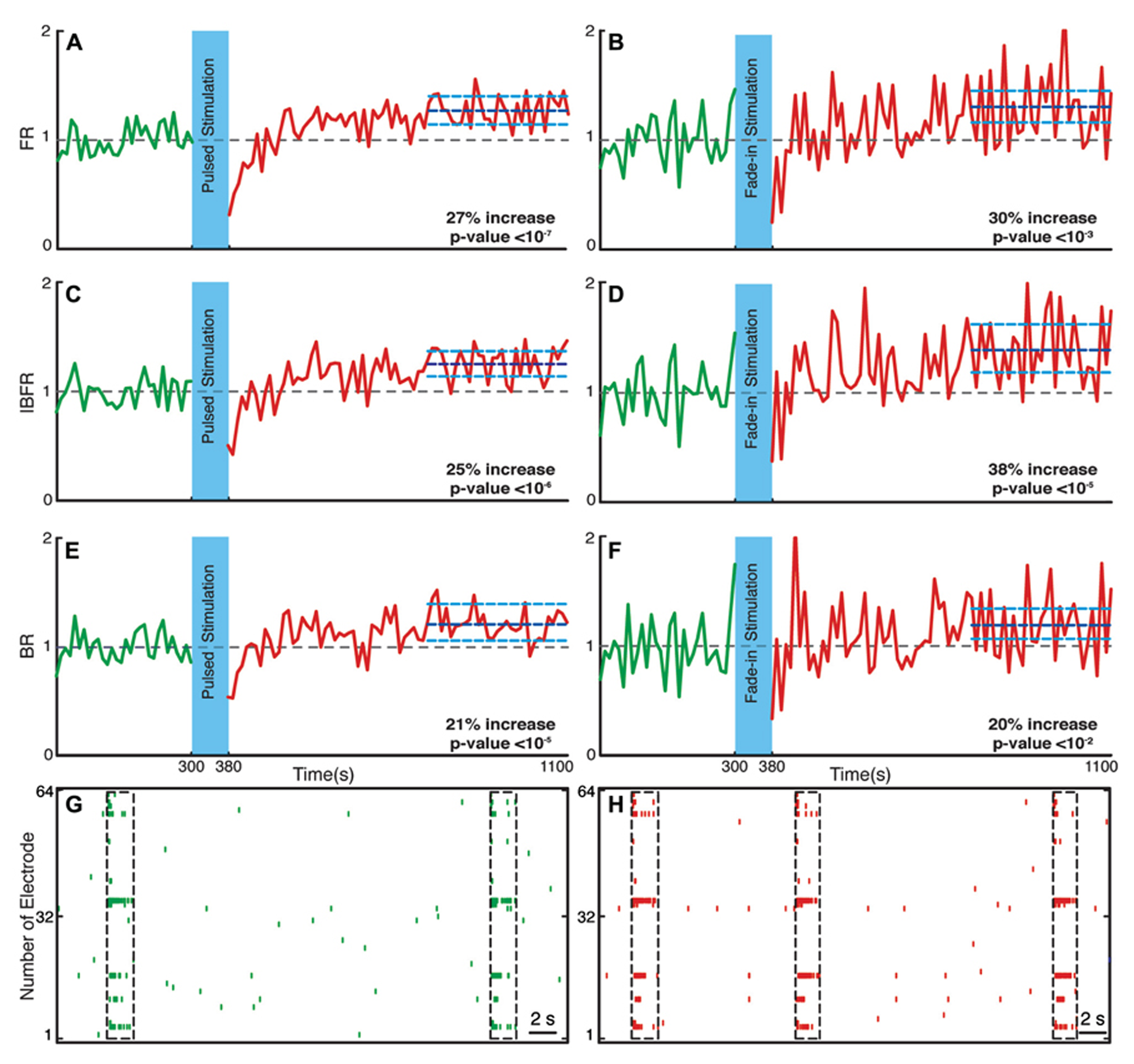 Changes in the network collective dynamics. Plots on the left side are for pulsed stimulation and the plots on the right side are for the fade-in stimulation. (A,B) Average normalized FR before and after stimulation. Here and in the other panels, the dotted gray line marks the mean before stimulation and the dark blue line marks the mean after stimulation. (C,D) Average normalized intra-burst firing rate (IBFR). (E,F) Average normalized burst rate. (G,H) An example of spontaneous activity before and after stimulation. In all plots, the light blue lines mark the 95% bootstrap confidence interval. The light blue column in all Figures (300 and 380 s) marks the light stimulation period. P values on each plot give the significance level for the increase of FR, burst occurrence rate, or IBFR during the last 5 min of recording, respectively. Results for the pulsed stimulation are averages over 18 experiments in 18 cultures. Results with the fade-in stimulation are averages over 16 experiments in 16 cultures.