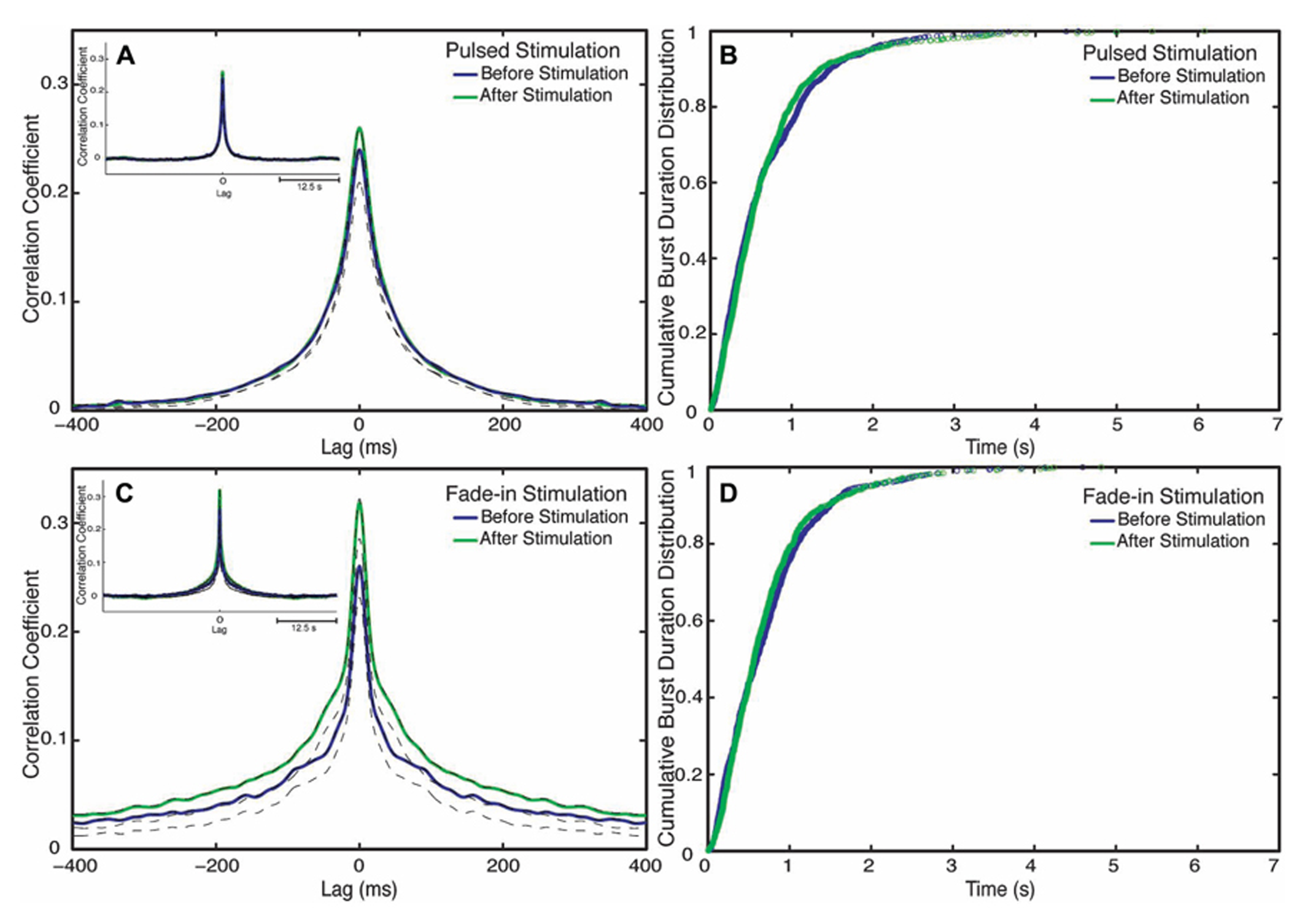 Changes in network synchronization. (A) Average cross-correlation function of pulsed stimulation, with the blue line representing the average cross-correlation function before stimulation and the green line representing the average-cross correlation function after stimulation. Dotted lines mark Jackknife confidence intervals. The inset represents the long-term dynamics of the average cross-correlation function. (B) Cumulative distributions of burst durations before stimulation (blue line) and after stimulation (green line) of pulsed stimulation. (C) Cross correlation functions of fade-in stimulation. The inset represents the average cross-correlation function on a 1 s timescale. (D) Cumulative distribution of the burst duration before stimulation (blue line) and after stimulation (green line) of fade-in stimulation.