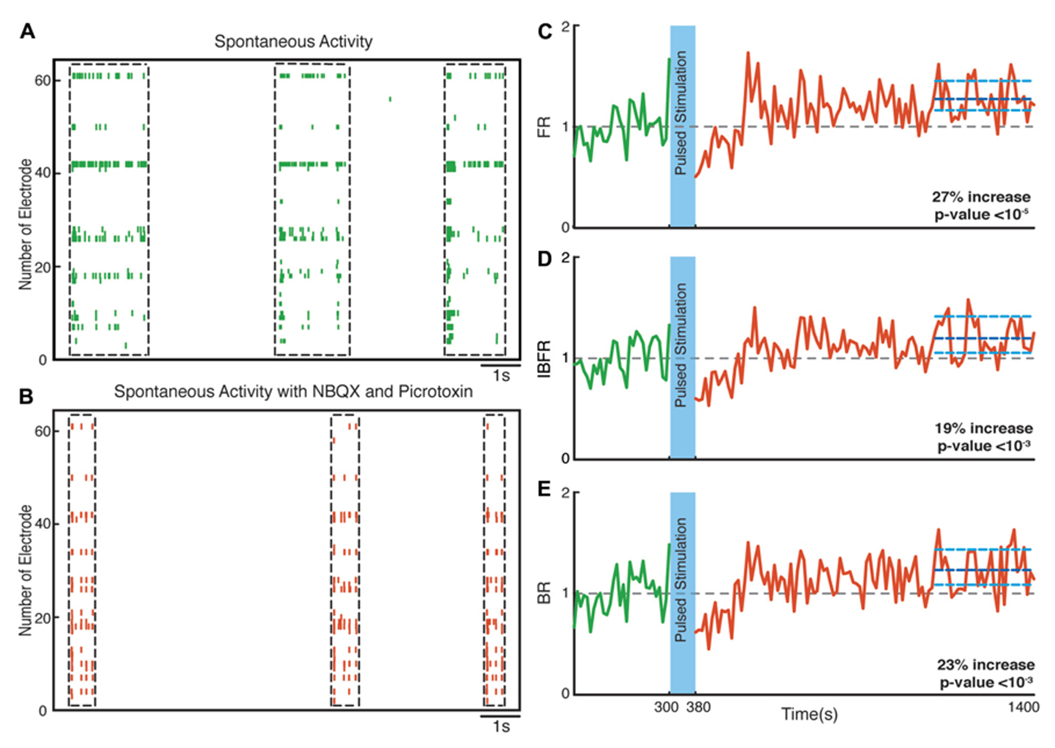 Network plasticity in the presence of NBQX/Picrotoxin. (A,B) Spontaneous activity (before stimulation) of a neuronal culture before and after adding NBQX/Picrotoxin. (C) Average normalized FR before and after stimulation. Here and in the other panels, the dotted gray line marks the mean before stimulation and the dark blue line marks the mean after stimulation. (D) Normalized average IBFR. (E) Normalized average burst rate. In all plots, the light blue lines mark the 95% bootstrap confidence interval. The light blue column in all figures (300 and 380 s) marks the light stimulation period. P values on each plot give the significance level for the increase of FR, burst occurrence rate, or IBFR during the last 5 min of recording, respectively. The results are averages in 10 experiments in 10 cultures.
