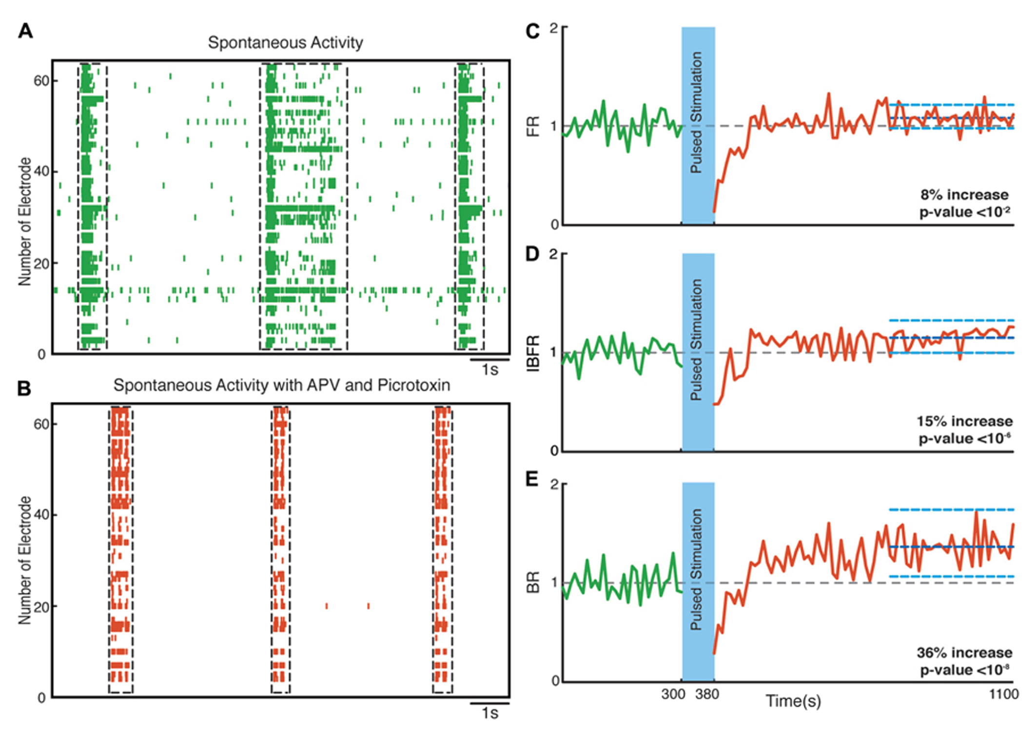 Network plasticity in the presence of APV/Picrotoxin. (A,B) Spontaneous activity (before stimulation) of a neuronal culture before and after adding APV/Picrotoxin. (C) Average normalized FR before and after stimulation Here and in the other panels, the dotted gray line marks the mean before stimulation and the dark blue line marks the mean after stimulation. (D) Normalized average IBFR. (E) Normalized average burst rate. In all plots, the light blue lines mark the 95% bootstrap confidence interval. The light blue column in all figures (300 and 380 s) marks the light stimulation period. P values on each plot give the significance level for the increase of FR, burst occurrence rate, or IBFR during the last 5 min of recording, respectively. The results are averages in 10 experiments in 10 cultures.