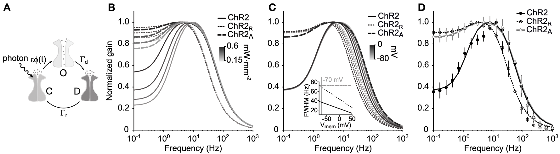 In order for ChR2 to be useful for delivering continuously-varying currents, it must allow (1) sufficient bandwidth to mimic synaptic communication and (2) repeatable current waveforms to be delivered across trials. Here, we address these requirements theoretically and experimentally. We find that wild-type ChR2 (ChR2) (Boyden et al., 2005) supports significant photocurrents up to 69 Hz, the H134R mutant (ChR2R) (Nagel et al., 2005) up to 37 Hz, and E123T/H134R mutant (ChR2A; also known as “ChETA”) (Gunaydin et al., 2010) up to 73 Hz, and show that evoked current waveforms are extremely repeatable across trials. Using the model, we find that the bandwidth over which ChR2R and ChR2 can convey time-varying stimuli is reduced with increasing membrane potential but that ChR2A's passband is unaffected. Finally, we show that wild type ChR2 supports a strong resonance with a natural frequency around 10 Hz. This resonance is present, but significantly attenuated, in the H134R and E123T/H134R mutants.