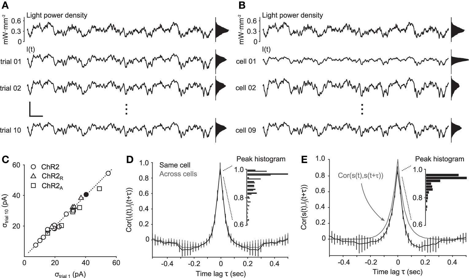 Reliability of continuously-varying neuronal photostimulation. (A) Intracellular currents from a single cell during Gaussian stimuli. The top trace is a portion of a 10-s Gaussian stimulus sequence. The bottom three traces show the intracellular currents recorded during different presentations of the same stimulus waveform. Scale bars, 200 pA and 200 ms. Scale bars apply to all time series traces in the figure. (B) The same stimulus waveform used in (A), and the corresponding evoked responses from different cells. (C) The standard deviation of the photocurrent induced on the first trial of stimulation versus on the last trial. The dotted line is identity. Points near the identity line indicate that there was little or no decrease in stimulus efficacy across trials. The filled dot corresponds to the cell in (A). (D) Normalized cross-correlation functions of photocurrents between neurons (gray) or autocorrelation function of photocurrents within the same neuron (black). The inset shows a histogram of peak correlation coefficients. (E) Normalized cross-correlation function between the stimulation process s(t) and recorded photocurrents. The gray line is the autocorrelation function of the stimulation process. The inset shows a histogram of peak correlation coefficients. Unless otherwise noted, data in this figure were obtained from cells expressing ChR2.