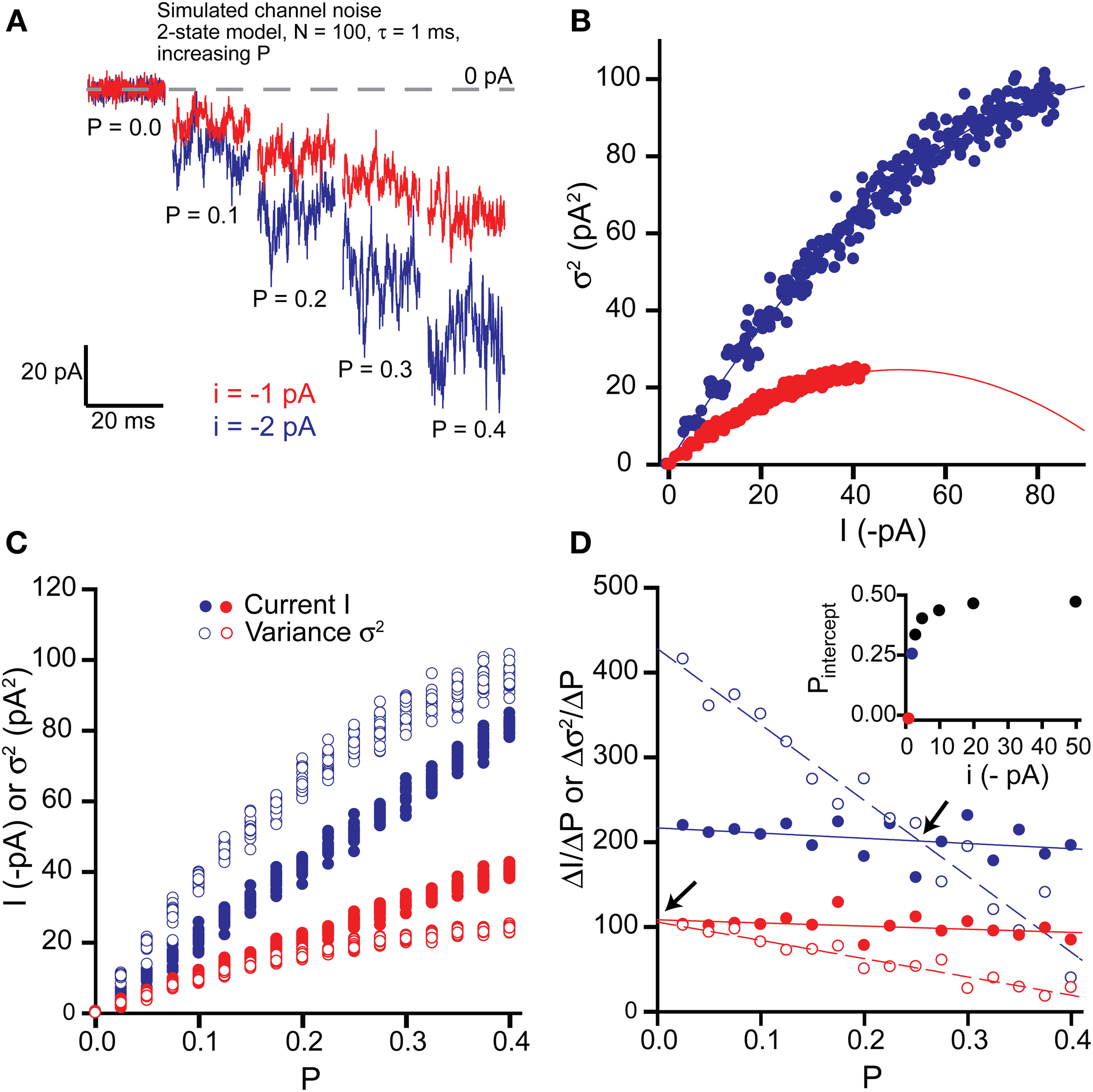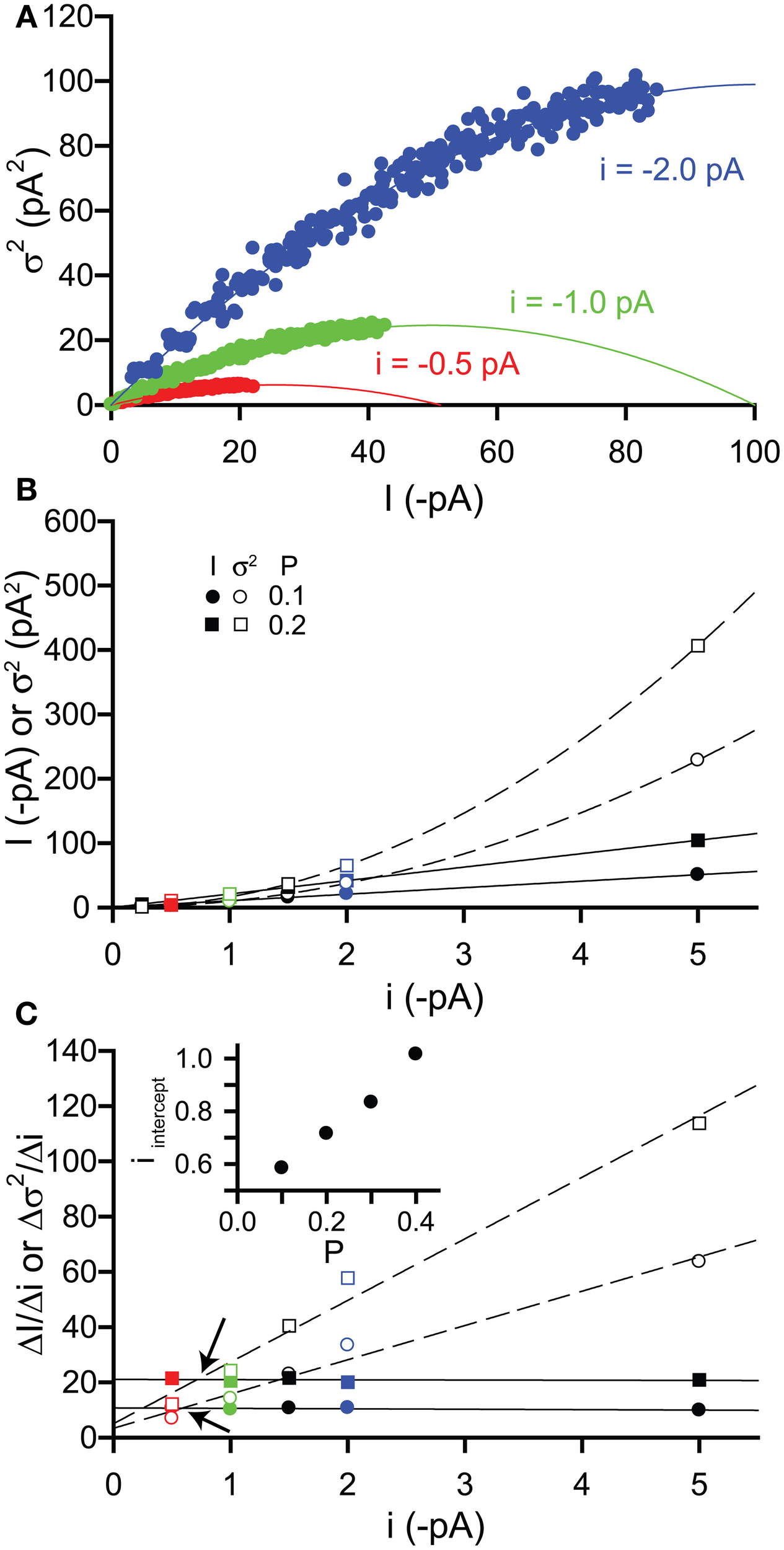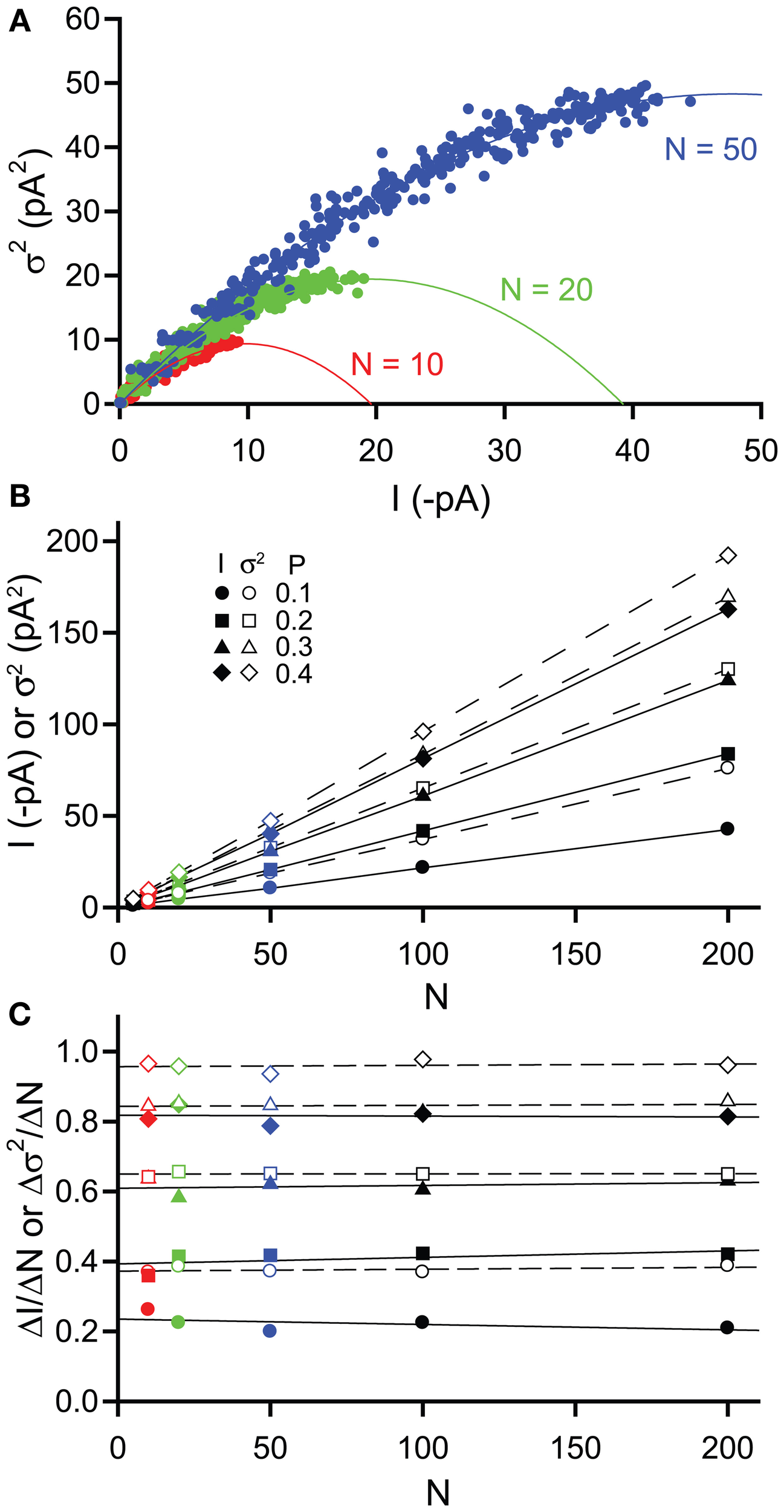 where n is the number of samples, I(x) is the current measured for the xth sample and I is the mean current defined by: If we assume that the channels function independently from each other and are either open or closed (i.e., only two states), then the mean current and variance can also be expressed using the channel open probability, P, and the single channel current, i, as: These equations (see (Hille, 1992) for derivations) can then be combined to give: Equation (3) relates the current I to the variance σ2. This is a parabolic equation with two roots at I = 0 and I = iN. Hence, there will be no noise when all of the channels are either fully shut (P = 0) or fully open (P = 1).