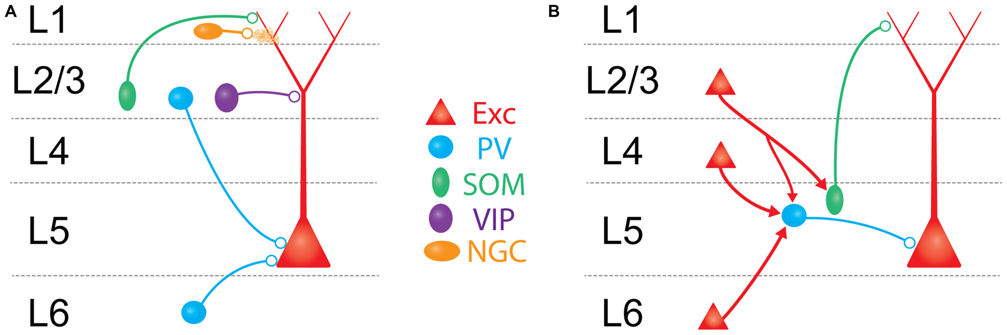 Figure 2. Schematic overview of major translaminar inhibitory circuits impinging on L5 PCs. (A) Inhibition arises from multiple types of interneurons outside of L5. In L1, 5HT3aR/Neurogliaform cells (NGCs, mustard) inhibit L5 PCs via volume release of GABA. In L2/3, SOM/Martinotti cells (green) and VIP cells (purple) target the apical dendrites of L5 PCs, while PV/basket cells (blue) synapse onto the perisomatic compartment via descending axons. In L6, translaminar PV/basket cells inhibit L5 PCs via ascending axons. (B) Excitatory translaminar pathways recruit L5 interneurons. Excitatory cells in L2/3, L4, and L6 can target PV/basket cells. Additionally, L2/3 PCs synapse onto L5 SOM/Martinotti cells.