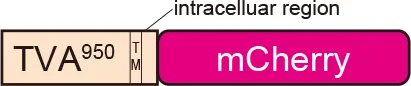 TVA has variants with different affinities. Among them, the original type TVA800 displays the highest affinity to EnvA; however, TVA800 is a glycophosphatidylinositol-anchored receptor without a transmembrane region (Bates et al., 1993; Gray et al., 2011). Thus, its N-terminal cannot be fused to a fluorescent protein for its visualization. Conversely, TVA950 is a single transmembrane receptor and can be fused to a fluorescent protein for the visualization of TVA-expressing starter cells: TVA950-EYFP (Faget et al., 2016), TVA950-mCherry (Watabe-Uchida et al., 2012), and low-affinity mutant TVA950E66T-mCherry (Miyamichi et al., 2013). The high sensitivity of TVA950-mCherry causes oEnvA-RVΔG-GFP infection to cells expressing TVA950-mCherry at a level where mCherry signals are not detected. Using TVA950-mCherry for rabies trans-complementation experiments, the starter cells appear mCherry-negative and GFP-positive with subsequent pseudo-negative results. To overcome this issue, we utilized TVA950E66T, a mutant TVA at E66T, with a lower affinity to oEnvA-RVΔG viruses (Rong et al., 1998; Miyamichi et al., 2013). Accordingly, the cells expressing TVA950E66T-mCherry at higher levels can be infected with oEnvA-RVΔG viruses allowing elimination of pseudo-negative cell populations because starter cells expressing high levels of mCherry can be unambiguously observed. Cells expressing lower levels of TVA950E66T with undetectable mCherry cannot be infected with oEnvA-RVΔG viruses. The strength of TVA950E66T-mCherry is the clear and reliable visualization of starter neurons during rabies tracing experiments because a high TVA950E66T-mCherry expression is required for oEnvA-RVΔG infection.