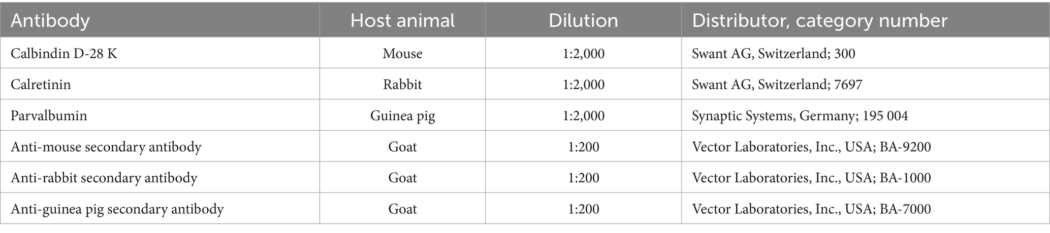 Most fast-spiking basket cells belong to parvalbumin immunopositive (PV+) INs, the largest IN population, which contribute to network synchrony and regulate the coactivity of neuronal ensembles (Rudy et al., 2011; Agetsuma et al., 2017). PV + INs represent one of the three non-overlapping populations that form local microcircuits with the PCs [besides vasoactive intestinal polypeptide (VIP) and somatostatin (SOM)], and their functional and morphological properties are widely investigated (Tasic et al., 2016; Tremblay et al., 2016; Hertäg and Sprekeler, 2019). Calretinin immunopositive (CR+) INs can be categorized into two major forms based on their dendrite arborization patterns: bipolar and multipolar (Camillo et al., 2018; Xu et al., 2010). They co-localized with VIP or SOM and elicit either a disinhibitory effect (Meskenaite, 1997; Gonchar and Burkhalter, 1999) or an effect that leads to a net inhibition of cortical activity (Camillo et al., 2018). For the third IN class, calbindin-D28K (CB)-containing neurons, limited knowledge and quantitative datasets regarding their density and distribution in the rodent brain are available to date (DeFelipe, 1997; Frantz and Tobin, 1994; Bjerke et al., 2020). CB is mainly expressed in INs with double-bouquet characteristics, but the protein has also been detected in PCs, for instance, in the medial entorhinal cortex and in the hippocampal CA1 region (Ray et al., 2014; Merino-Serrais et al., 2020). Nevertheless, the functional role of this subtype is still elusive (Li et al., 2017; Harris et al., 2016).