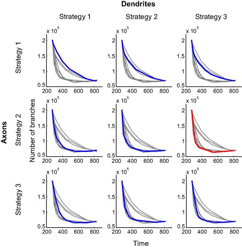 Figure 4. Performance boundaries for different combinations of branching strategies used by axons and dendrites. The performance boundary depicts the minimal number of branches that are required to establish connectivity with a given level of precision after a given length of time. Alternatively, it provides the minimal time required to achieve the configuration with a given level of precision using a predetermined number of branches. In each panel, the colored curve (blue or red) represents the boundary for a specified combination of branching strategies. The boundaries for other combinations are shown in grey, for comparison. The red curve depicts the optimal performance boundary that corresponds to the combination of Strategies 2 and 3, used by axons and dendrites, respectively.