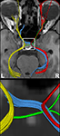 Figure 5. (Top) Separation of right- and left-hemispheric fibers in the optic nerve and optic tract. (Bottom) Magnification of fiber tracks crossing the optic chiasm: tracks from the left eye to the left (yellow) and right LGN (blue), tracks from the right eye to the left (green) and right LGN (red). R, right, L, left.