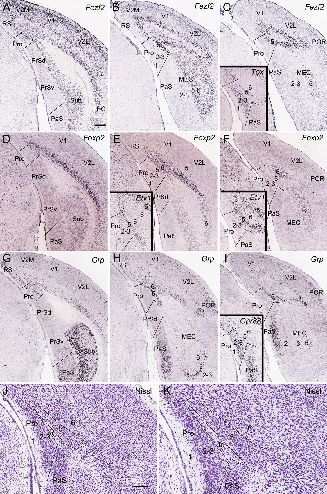 Figure 1. Location topography of mouse prostriata (Pro). Panels (A–I) and all the insets are ISH-stained sections, while panels (J) and (K) are Nissl-stained sections. Arabic numerals indicate cortical layers. (A–C) Three rostral (A) to caudal (C) coronal sections showing Fezf2 expression in the Pro and adjoining regions. Strong Fezf2 expression is mainly seen in layers 5 and 6 (L5–6) of the Pro, retrosplenial (RS), presubiculum (PrS), medial entorhinal cortex (MEC), and lateral entorhinal cortex (LEC) and neocortical regions (V2M, V1, V2L, and POR) as well as in the Sub. L2–3 of the visual cortices also show faint expression. The inset in panel (C) shows Tox expression in L2–3 and L5 of the Pro. (D–F) Three rostral (D) to caudal (F) sections showing Foxp2 expression in L6 of the Pro and adjoining cortical regions. The insets in panels (E,F) show Etv1 expression in L5 of the Pro and adjoining regions. (G–I) Three rostral (G) to caudal (I) sections showing Grp expression in the Pro and adjoining regions. Strong Grp expression is observed in L5–6 of the Pro, L2 of the RS, ventral part of the PaS, L5 of the MEC, and L2–3 and L5 of the postrhinal cortex (POR) as well as in the Sub. The inset in panel (I) shows Gpr88 expression in the PaS and L2–3 of the Pro. (J,K) Cytoarchitecture and layers of the Pro shown at lower (J) and high (K) magnifications of a Nissl-stained section. Note the cell-sparse lamina dissecans (ld) separating L2–3 from L5 of the Pro. For abbreviations see the list. Bar: 350 μm in panel (A) (for A–I and all insets); 210 μm in panel (J); 130 μm in panel (K).