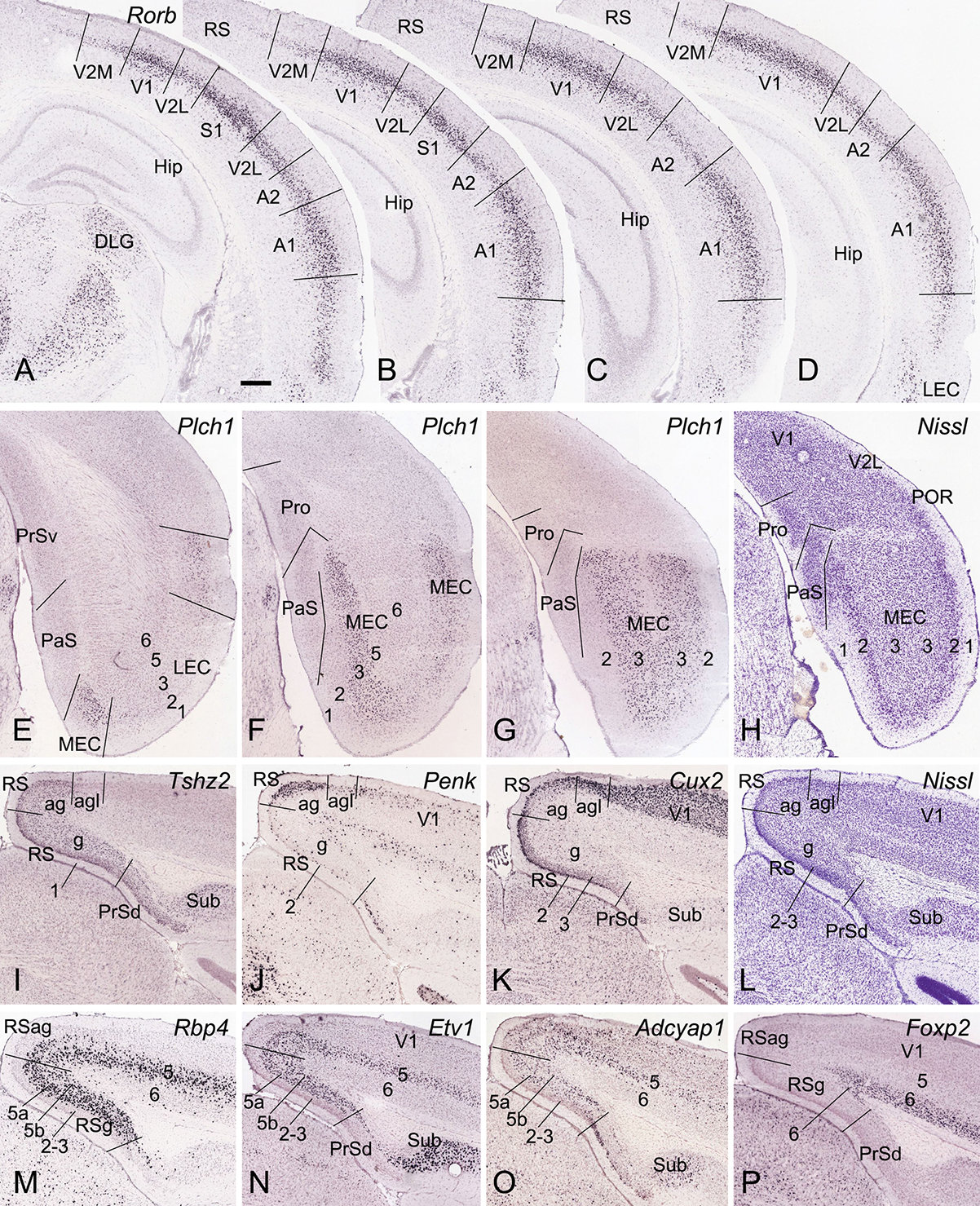 Figure 2. Locations and subdivisions of visual, auditory, entorhinal, and retrosplenial cortices. Panels (A–G) and (I–K) are ISH-stained sections while panels (H,L) are Nissl-stained sections. (A–D) Four rostral (A) to caudal (D) coronal sections showing Rorb expression in L4 of the primary and secondary visual and auditory cortices (V1, V2M, V2L, A1, and A2) as well as in the caudal S1. Note the strong and moderate Rorb expression in the primary (V1, S1, and A1) and secondary/association (A2, V2M, V2L) sensory cortices, respectively. No or little Rorb expression is seen in the RS. (E–G) Three rostral (E) to caudal (G) sections showing little and strong Plch1 expression in L3 of the lateral and medial entorhinal cortex (LEC and MEC), respectively. (H) A Nissl-stained section showing the locations of the Pro, PaS, and L2 of the MEC. (I–L) Four sections stained respectively for Tshz2 (I), Penk (J), Cux2 (K), and Nissl (L) showing the locations of three RS subdivisions (RSg, RSag, and RSagl), which display differential molecular signature and cytoarchitecture. (M–P) Four sections stained respectively for Rbp4(M), Etv1 (N), Adcyap1 (O), and Foxp2 (P) showing lamination of the RS. Note the thick L5 in the RS, which can be subdivided into 5a and 5b. Bar: 350 μm in panel (A) (for all panels).