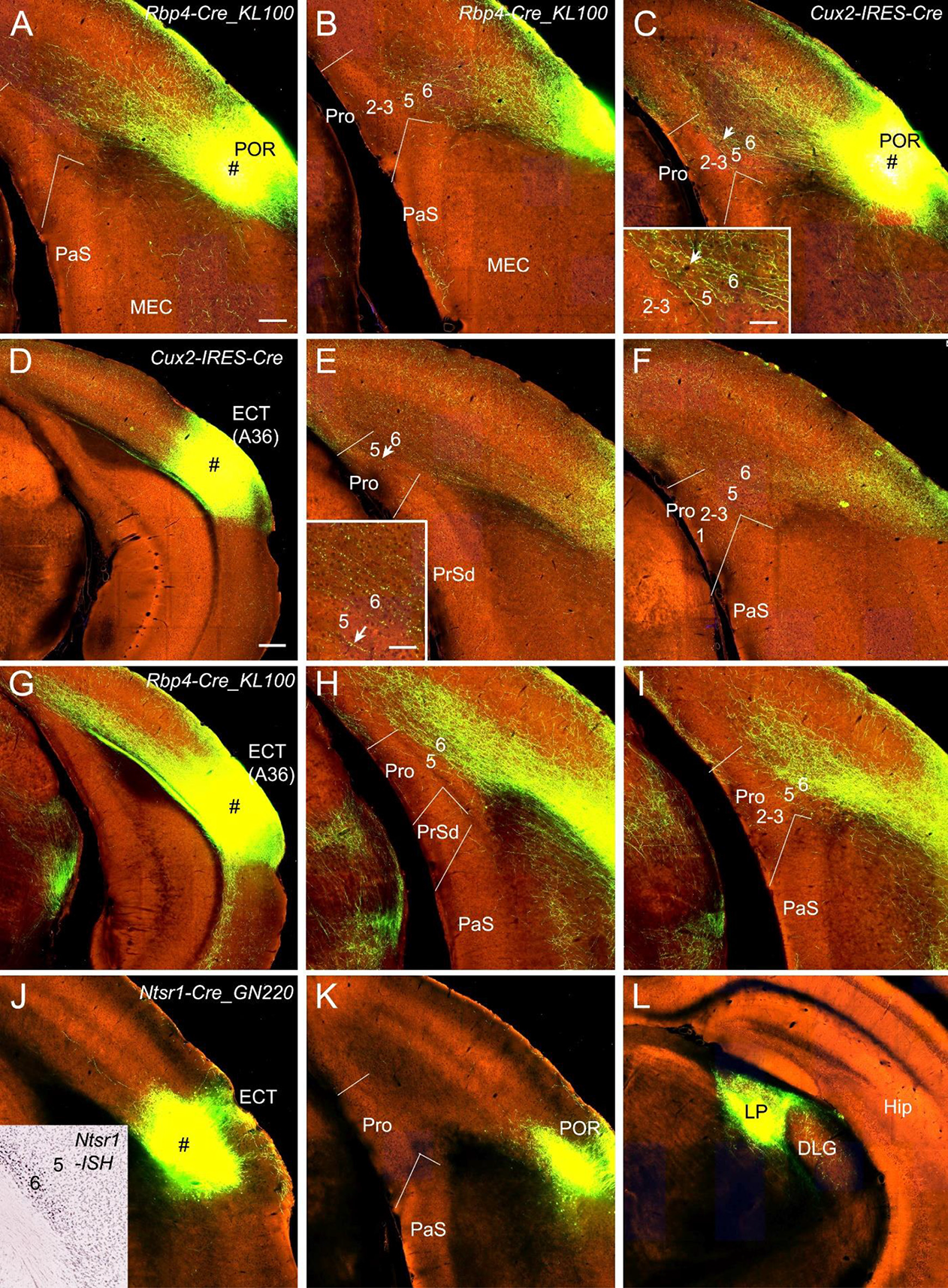 Figure 5. Projections from postrhinal and ectorhinal cortices to the Pro. (A,B) An injection in POR (# in A) of a Rbp4-Cre_KL100 mouse (Cre expression in L5) produces moderate and weak terminal labeling in L6 and L5 of the Pro, respectively (A,B). (C) An injection in POR (#) of a Cux2-IRES-Cre mouse (Cre in L2–4) leads to moderate terminal labeling in L6 (with less in L5) of the Pro, which is magnified in the inset. (D–F) An injection in ECT (i.e., Brodmann area 36; # in D) of a Cux2-IRES-Cre mouse (Cre in L2–4) results in weak terminal labeling in L6 of the Pro (E,F). The labeling in L6 of the Pro is magnified in the inset. (G–I) An injection in ECT (# in G) of a Rbp4-Cre_KL100 mouse (Cre in L5) leads to strong terminal labeling in L6 of the Pro (H,I). (J–L) An injection in ECT (# in J) of a Ntsr1-Cre_GN220 mouse (Cre in L6; see the inset in J for ISH) produces no labeling in the Pro (K) and strong labeling in lateroposterior nucleus (LP in L). Arrows in low- and high-magnification images of the Pro point to corresponding locations. Bars: 200 μm in (A) (for A–C, E, F, H, I, J–L, and the inset in J); 350 μm in (D) (for D,G); 70 μm in the insets in (C) and (E).