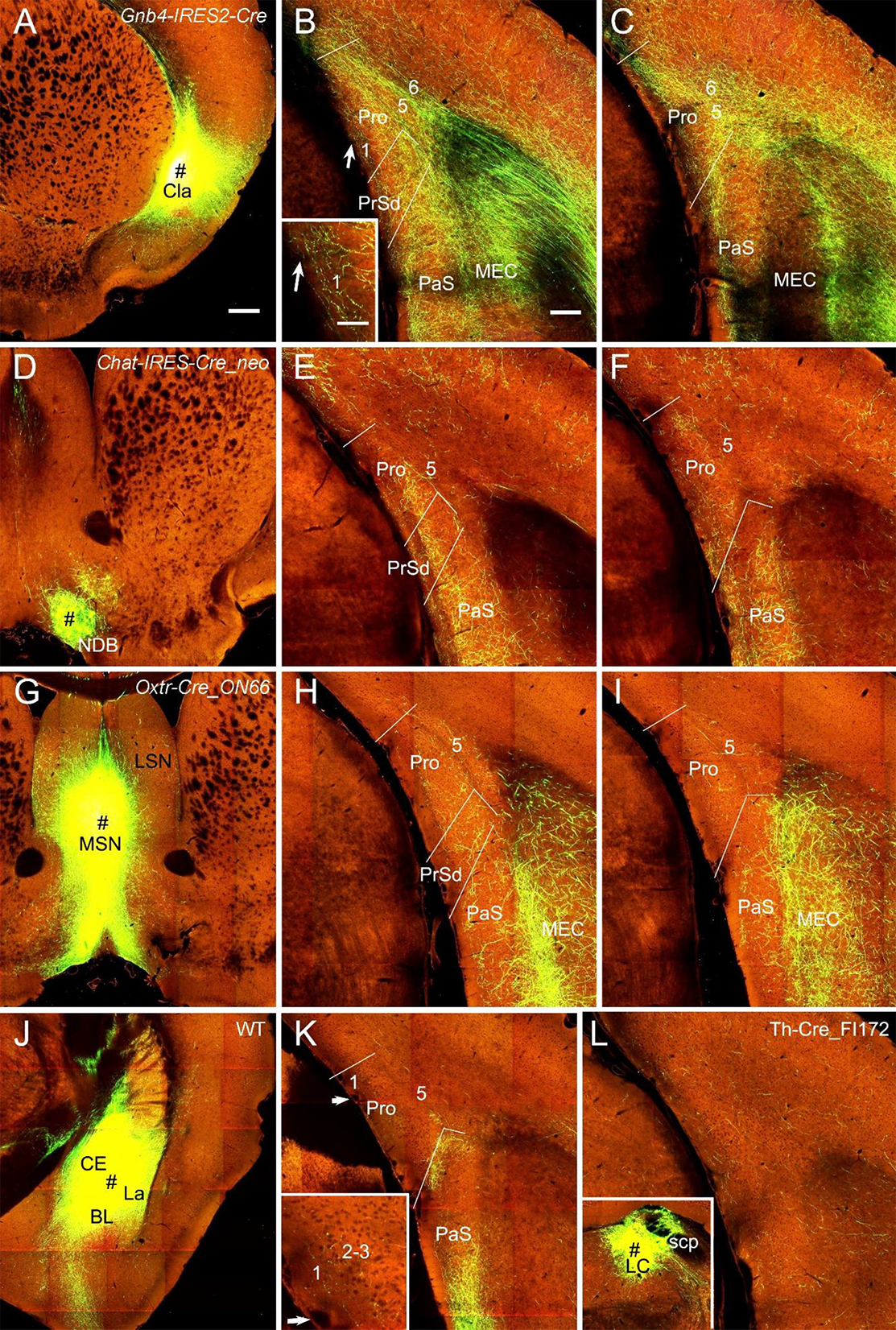 Figure 9. Projections from subcortical regions to the Pro. (A–C) An injection in the claustrum (Cla) of Gnb4-IRES-Cre mouse (Cre expression in Cla) results in obvious labeling in all layers of the Pro and adjoining regions. Moderate terminal labeling in L1–3 and strong labeling in L5–6 of the Pro is observed (B,C). The labeling in L1 of the Pro in (B) is magnified in the inset. (D–F) An injection in the nucleus of diagonal band (NDB; # in D) of a Chat-IRES-Cre_neo mouse (Cre in NDB) yields terminal labeling in L1–3 of the Pro with less in L5–6 (E,F). Stronger labeling is seen in PaS. (G–I) An injection in medial septal nucleus (MSN; # in G) of an Oxtr-Cre_ON66 mouse (Cre in MSN) gives rise to weak terminal labeling in L2–5 of the Pro (H,I). Note the relatively stronger labeling in PrSd and PaS and the very strong labeling in the medial portion of the MEC. (J,K) An injection in the amygdalar region (CE, BL, and La; # in J) of a WT mouse results in weak terminal labeling in L1–3 of the Pro (K). The Pro labeling in (K) is magnified in the inset. Injections restricted in the central nucleus (CE) or basolateral nucleus (BL) yields no labeling in the Pro (not shown). (L) Weak terminal labeling in L1–6 of the Pro after an injection was placed in locus coeruleus (LC) of a Th-Cre_FI172 mouse (# in the inset in L). Bars: 350 μm in (A) (for A, D, G, J, and inset in L); 200 μm in (B) (for other panels); 70 μm in the inset in (B) (also for the inset in K).