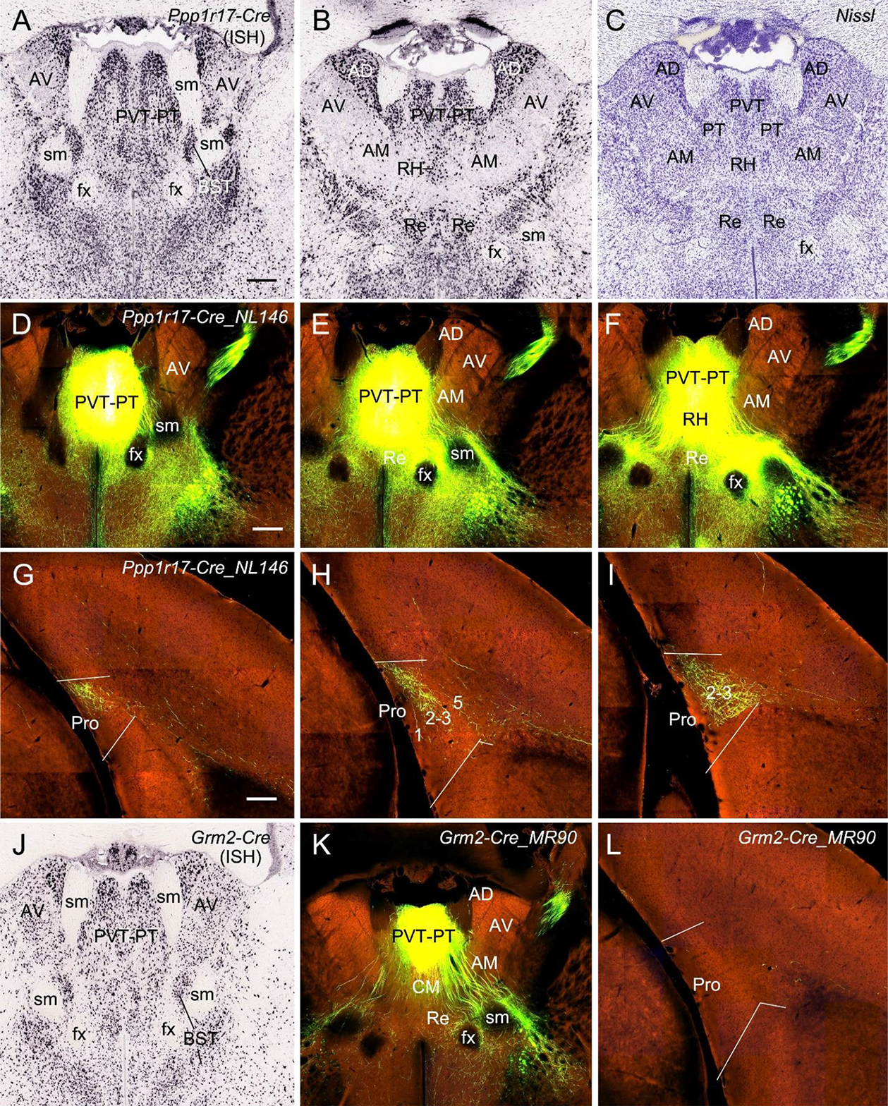 Figure 11. Projections from anterior midline thalamic region to the Pro. (A–B) Two sequential sections of the anterior midline thalamic region (ATh) showing Ppp1r17-Cre expression in paraventricular-parataenial nuclei (PVT-PT) and adjoining RH, AD, and AM. (C) A Nissl-stained section adjacent to (B) showing the architecture of the PVT-PT and adjoining regions. (D–I) One large injection in the PVT-PT and the adjoining ATh structures (D–F) of a Ppp1r17-Cre_NL146 mouse leads to strong terminal labeling in L2–3 of the Pro with much fewer in deep L1 (G–I). Panels (D–F) are three serial sections of the ATh, and (G–I) are three sequential sections of the prostriata region. (J) One section at the level (A) showing Grm2-Cre expression in the PVT-PT and adjoining regions. (K,L) One smaller injection in the PVT-PT (K) of a Grm2-Cre_MR90 mouse produces no terminal labeling in the Pro (L). Bar: 330 μm in (A) (for A–C and J); 350 μm in (D) (for D–F, K); and 200 μm in (G) (for G–I and L).