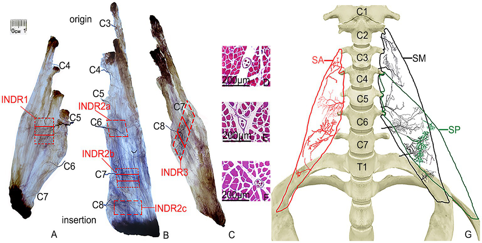 Sihler’s staining of the SA, SM, and SP muscles and representative muscle spindles in the highest region of muscle spindle abundance. (A–C) Sihler staining of the SA, SM, and SP muscles (superficial view). Red boxes indicate INDR1, INDR2a, INDR2b, INDR2c, and INDR3. (D–F) Representative muscle spindles with the highest abundance of INDR1, INDR2b, and INDR3 (scale: 200 μm). (G) Distribution pattern of the intramuscular nerves of the SA, SM, SP are shown in red, black, and green, respectively.