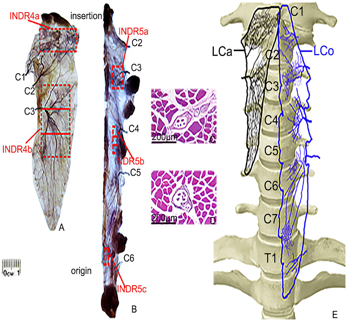Sihler’s staining and representative muscle spindles in the highest region of muscle spindle abundance in the LCa and LCo muscles. (A,B) Sihler’s staining of the LCa and LCo (superficial view). Red boxes indicate INDR4a, INDR4b, INDR5a, INDR5b, and INDR5c. (C,D) Representative muscle spindles with the highest abundance in INDR4b and INDR5b (scale: 200 μm). (E) Distribution pattern of the intramuscular nerves of the LCa and LCo are shown in black and blue, respectively.