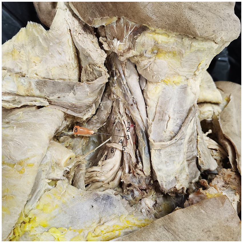 Simulated puncture of right SA muscle CRHMSA. 1: SA muscle, 2: phrenic nerve, 3: ascending cervical artery, 4: 5th cervical nerve (C5), 5: transverse cervical artery, 6: SM muscle, 7: SP muscle, 8: needle.