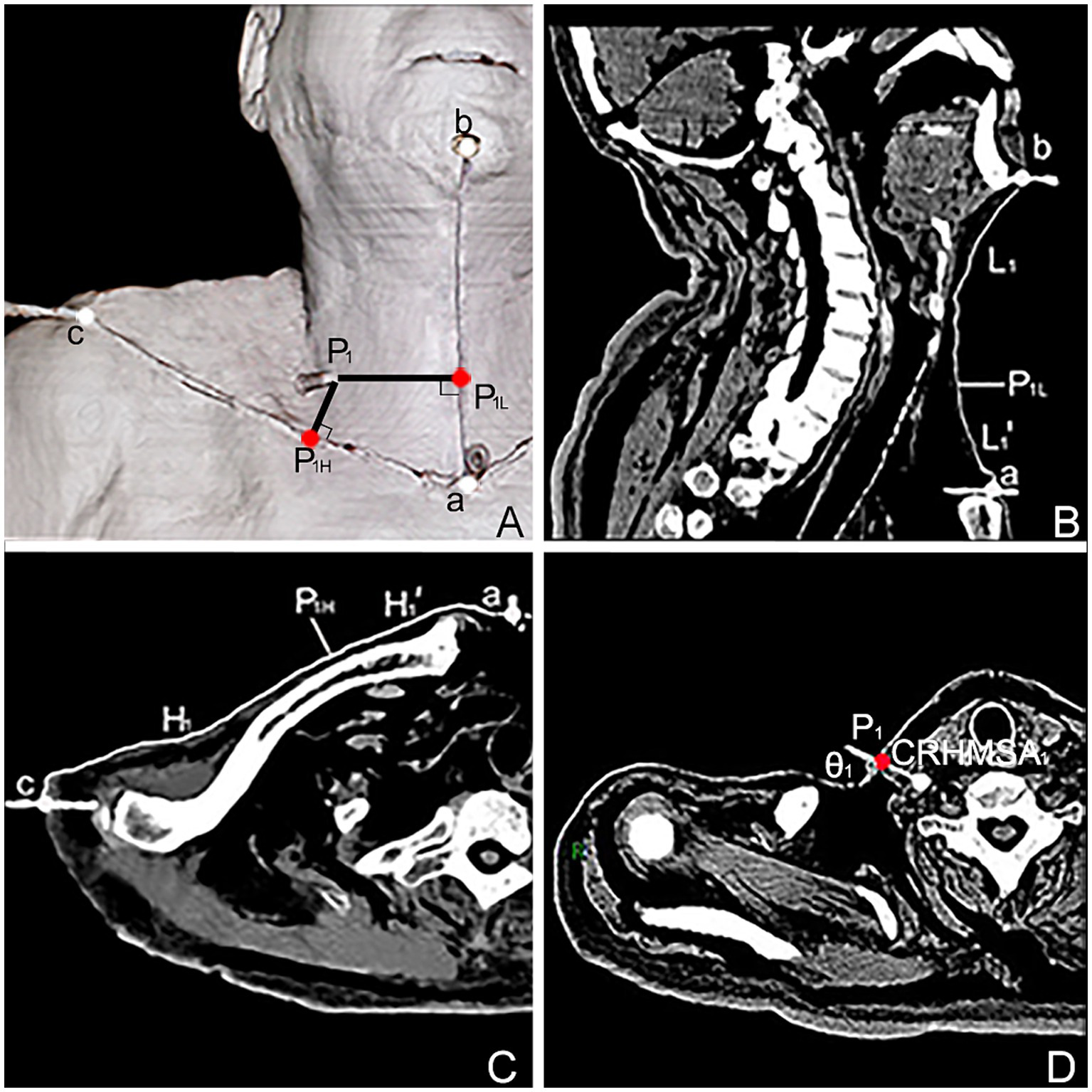 The projection points (P) of the CRHMSAs on the anterior surfaces of the neck is denoted as point P, the intersection of a straight line passing through point P, which is perpendicular to the H line, with the H line is denoted as PH (P1H-P5H). Similarly, the intersection of a horizontal line passing through point P and the L line is denoted as PL (P1L-P5L). The distance from point a to point b is equal to the length of the L line. The distance from point a to point c is equal to the length of the H line. The distance between points a and PH is denoted as H′ (H1–H5’), and the distance between points a and PL is denoted as L’ (L1–L5’). Calculations were performed for H′/H × 100% and L’/L × 100% to determine the percentage position of point P on the body surface. Additionally, the sharp angle between the puncture needle and the skin was recorded as θ1, θ2, θ3, θ4, and θ5. Measurements were taken for the angle θ and the depth of the CRHMSA.
