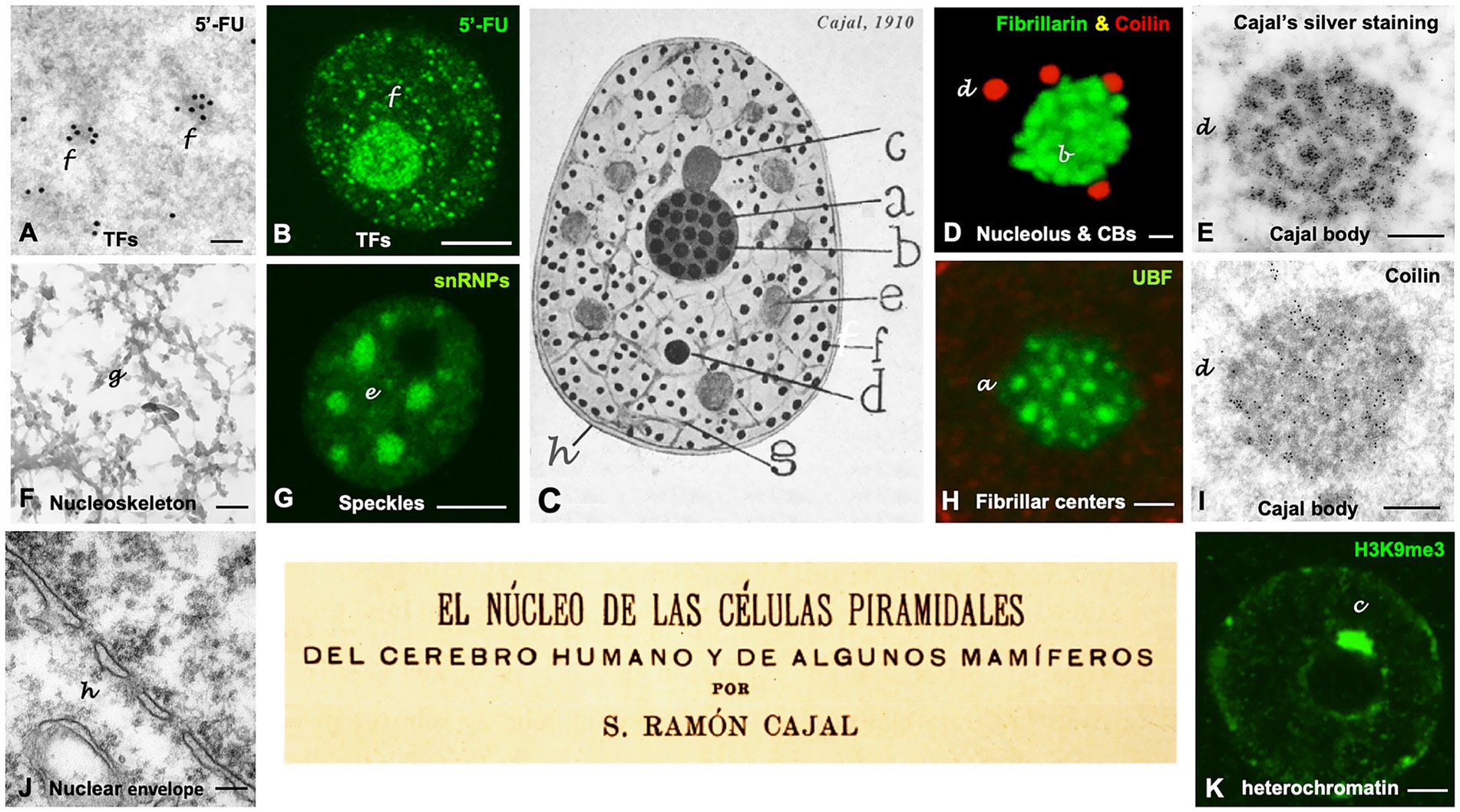 Cajal would undoubtedly be delighted to see that the nuclear structures he described in the early 20th century have been validated using modern technologies. More than a century later, the accuracy and reliability of his observations -including his quantitative estimates of certain nuclear structures-remain astonishing and inspiring. Cajal would also be pleased to know that the structures he meticulously documented are now recognized as key components in the functional organization of the nucleus and in maintaining cellular homeostasis. In recognition of his pioneering contributions to the study of the cell nucleus, Cajal’s name will forever be associated with one of its hallmark structures, the “Cajal body.”