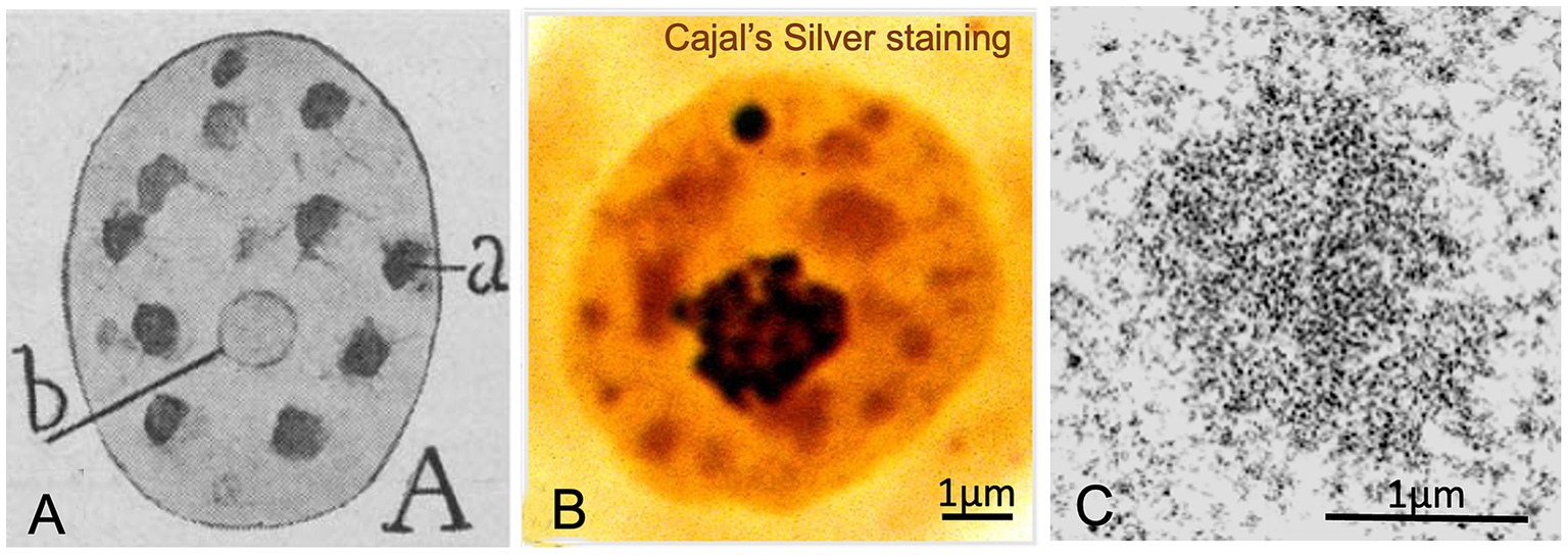 In 1903, using the reduced silver nitrate procedure, Cajal discovered a round, sharply defined nuclear body in several types of neurons. This structure, approximately 0.5 μm in diameter, exhibited a strong affinity for colloidal silver (Figures 1C, 2A, 5A). He termed this structure the accessory body of the nucleolus (Cajal, 1903, 1910). Cajal also noted neuron size–dependent variation in the number of accessory bodies (from 1 to 3) and concluded that they represent a distinct nuclear structure distinguishable by morphology, size, and silver affinity from argyrophilic nucleolar spherules, hyaline grumes, the Levi basophilic grume, and micronucleoli (Figure 3B).