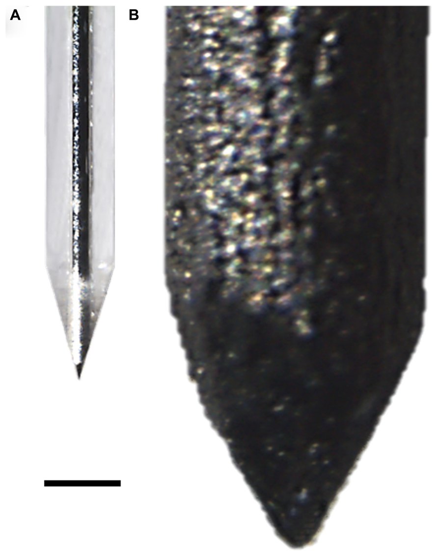 FIGURE 1. Implantable wires used in this study. (A) Single-core quartz insulated metal microelectrode (Thomas Recording, Giessen, Germany). (B) Black-lead wire. Scale bar 100 μm.