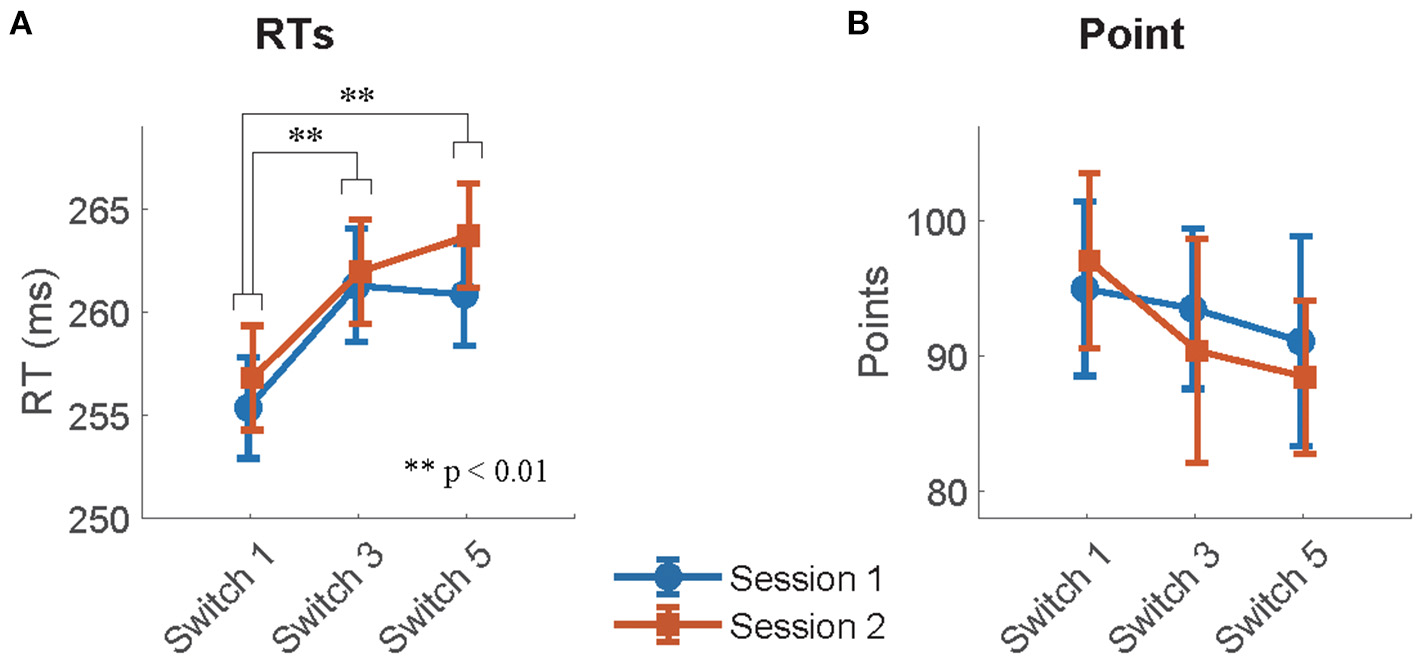 To evaluate the effect of switch types on participant behavior, the RTs of Good trials and the obtained points in the task were submitted to linear mixed effect models (LME). The model included switch types, sessions, and interactions as fixed effects. Participants were processed as a random effect. The model for RTs in the Wilkinson notation is RT~switch+session+switch:session+(1∣participants) (Model 1). The same model was fitted using points in the sessions as a target variable.