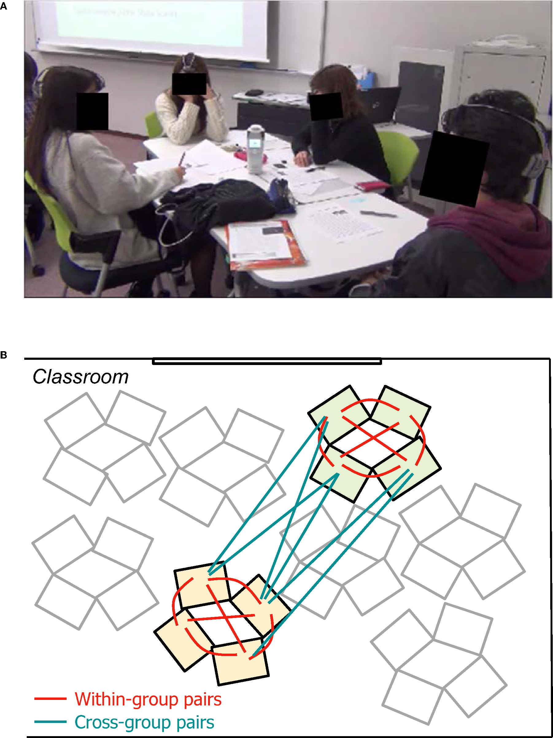 (A) Snapshot of a working collaborative learning group with their mPFC activities being measured with wireless fNIRS devices. (B) Illustration of student pair types. Within-group pairs and cross-group pairs are indicated in red and blue lines, respectively. For visibility, only six out of 16 cross-group pairs are illustrated.