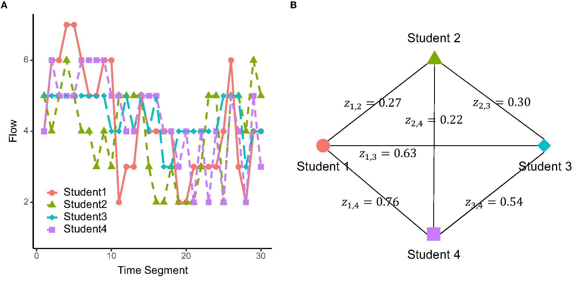 Figure 2A shows an example of the flow dynamics for a group of four students. In this group, Student 2's flow dynamics were relatively divergent from the other members, with lower temporal correlation values with other members (z1,2 = 0.27, z2,3 = 0.30, z2,4 = 0.22), compared to the more convergent flow dynamics between the other three (z1, 3 = 0.63, z1,4 = 0.76, z3,4 = 0.54; Figure 2B).