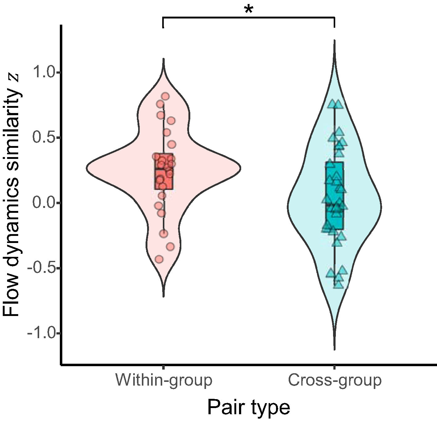 Similarity of flow dynamics between pairs of students within the same active-learning group (within-group) vs. across different groups (cross-group). Asterisk indicates significant difference (p < 0.05) between the pair types.