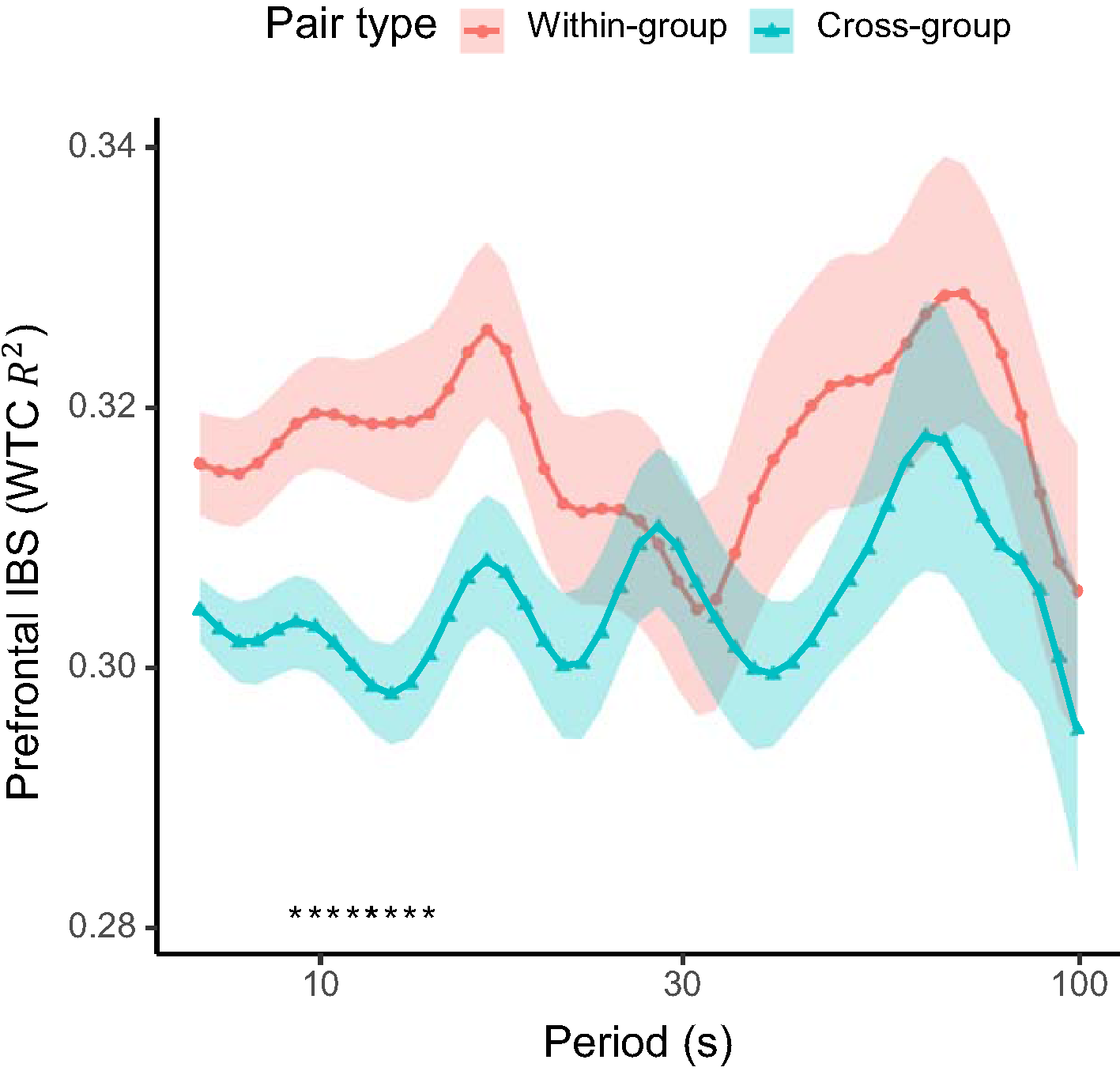 Prefrontal inter-brain synchronization (IBS) between pairs of students within the same active-learning group (within-group) and across different groups (cross-group). Solid lines show the mean and shaded areas the standard error of the mean for each pair type. Asterisks at the bottom indicates periods with a significant difference (q < 0.05; FDR-adjusted) between the pair types.
