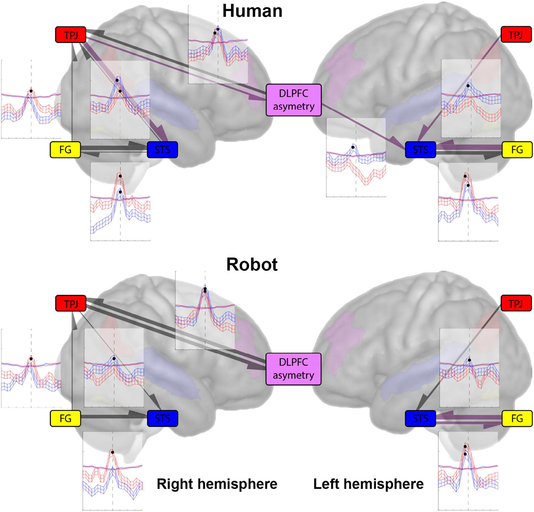 In the left hemisphere, we see no dynamic causal relationship between the DLPFC asymmetry and the FG, nor between the DLPFC asymmetry and the TPJ in either the human nor the robot case. The only significant causation is from the DLPFC asymmetry to the STS (mean ρ = 0.1765, lag = −2 ≈ 602.5 ms) in the human case. The absence of causation between the DLPFC asymmetry and the FG (and STS), indicates that the effects are lateralized.