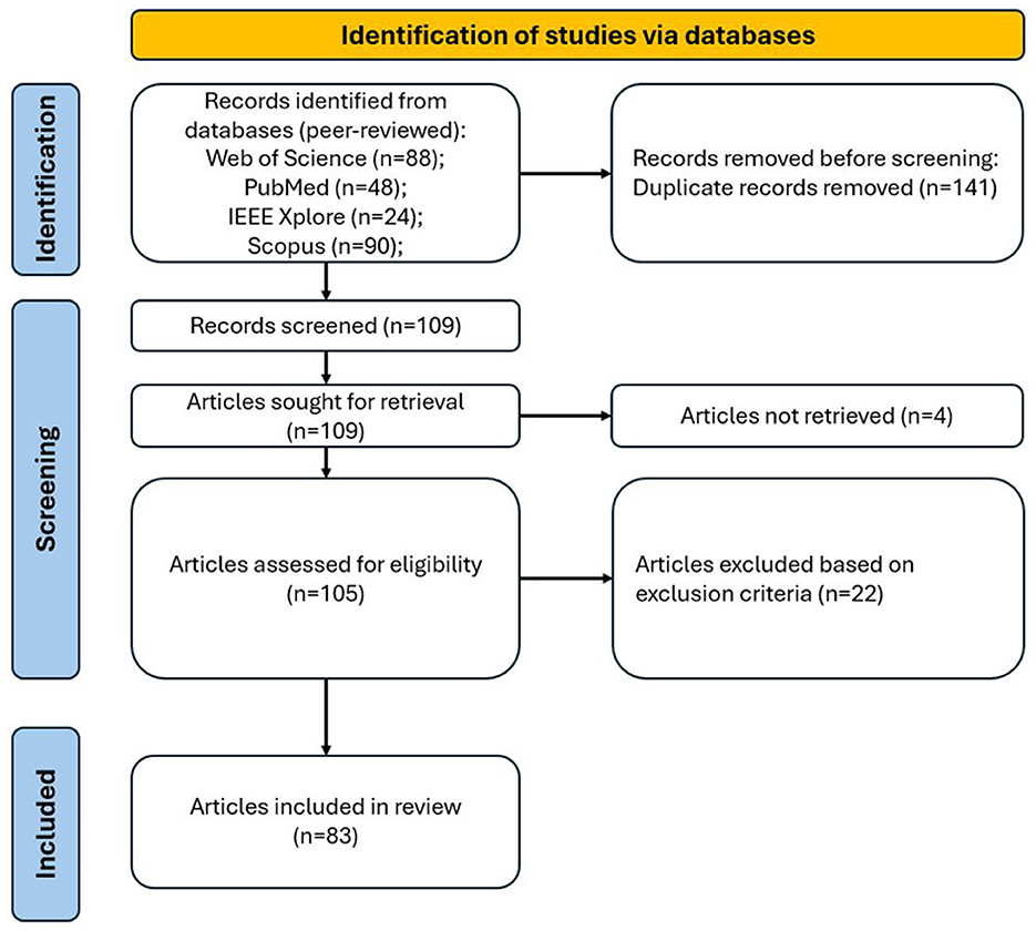 The systematic literature review flow diagram, guided by the PRISMA methodology, is illustrated in Figure 1. Initially, the search found 250 records. After the removal of duplicate records, 105 records were retrieved and underwent screening based on exclusion criteria. The selection led to 83 articles to be included in the research. These articles underwent a detailed full-text analysis.