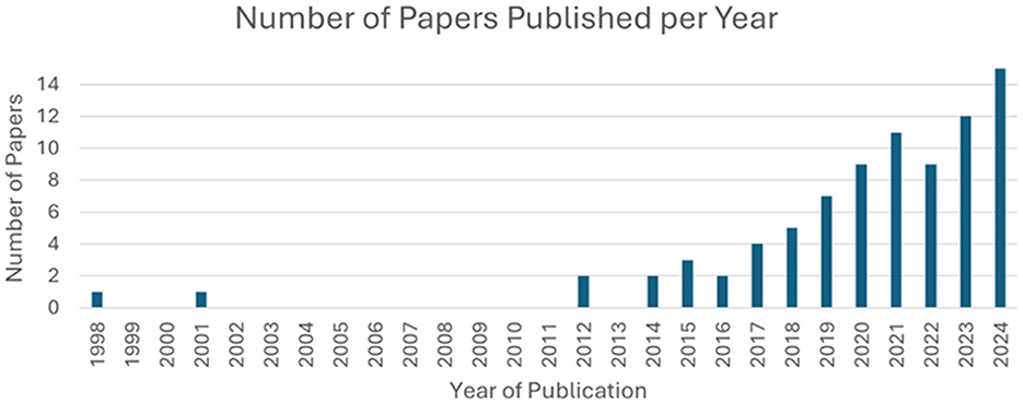 A bibliometric analysis was conducted to evaluate the contributions from countries and the number of papers published per year that were included and analyzed in this review. Over 85% (72 out of 83) of the analyzed studies have been conducted since the year 2017. As depicted in Figure 2, publications on this topic show a consistent upward trend over the years.