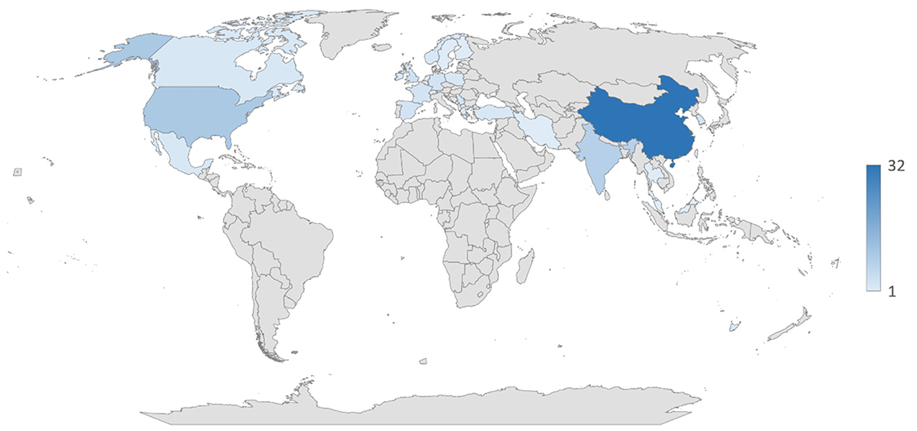 Figure 3 presents the contributing countries in this field. The highest number of studies (32) were conducted in China, followed by the USA (10), and India (8). The rest of the countries had 5 or less publications per country.