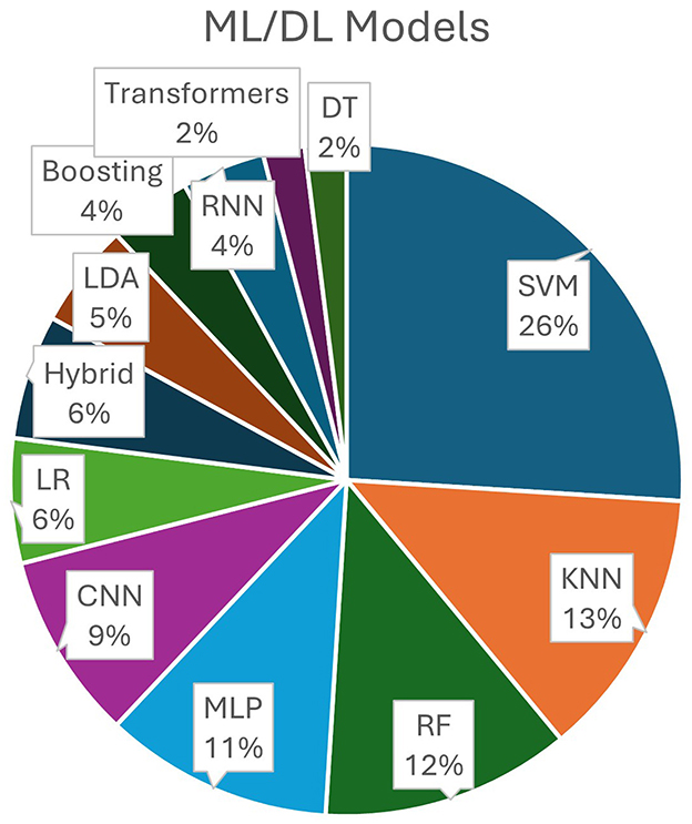 Figure 4. ML/DL models distribution: SVM (Support Vector Machine); KNN (K-Nearest Neighbors); RF (Random Forest); MLP (Multi-Layer Perceptron); CNN (Convolutional NN); LR (Linear/Logistic Regression); Hybrid (hybrid models-combinations of convolutional, recurrent, and transformer models); LDA (Linear Discriminative Analysis); Boosting models; RNN (Recurrent NN); Transformers; DT (Decision Trees).
