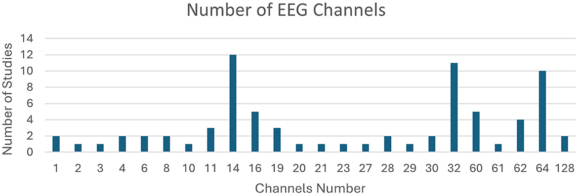 Studies employed different EEG acquisition devices with various layouts. Numbers of channels used across studies are presented in Figure 5.