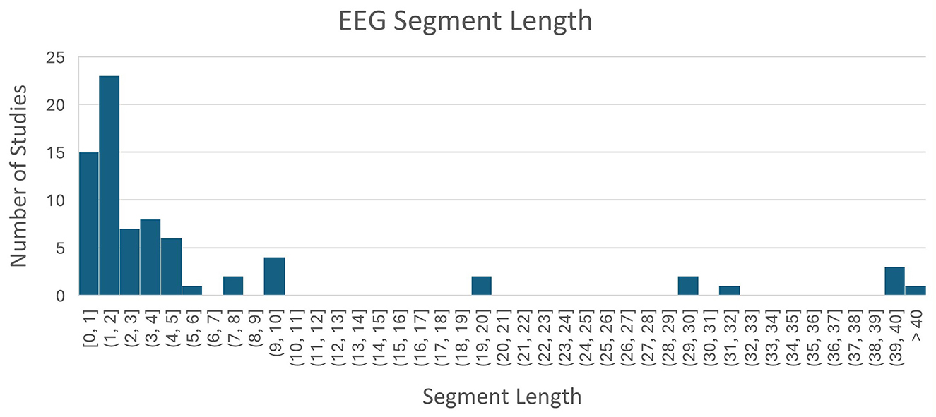 Models classified EEG segments of various lengths and various numbers of classes (MWL levels). As we can see in Figure 6, most studies used EEG segment lengths below 2 s, opting for higher temporal resolution of predictions. Also, the decreasing trend in Figure 7 shows that less studies opted for higher classification resolution (more MWL levels), with the majority of them using only two classes.