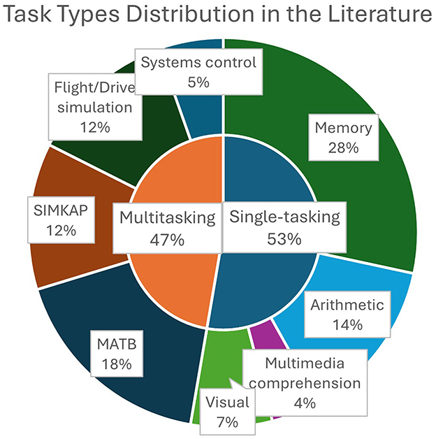 Further division was based on the specific task employed. In the single-tasking category, we identified: memory tasks, arithmetic tasks, multimedia comprehension tasks, visual cognitive tasks, and other tasks. In the multitasking category, we identified more complex tasks including systems control, flight/drive simulation, MATB, and SIMKAP.