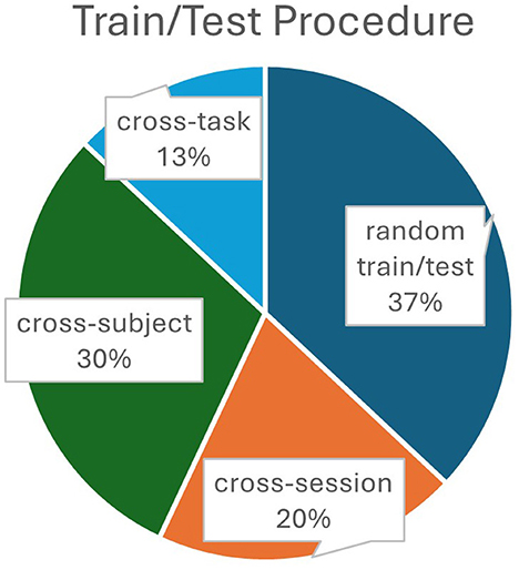 Percentages of the training/testing procedures used in the analyzed studies are visually presented in Figure 9, showing that a significant proportion of studies (37%) employed the random data split model training/testing procedure which is susceptible to data leakage issue explained above.