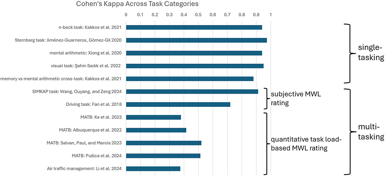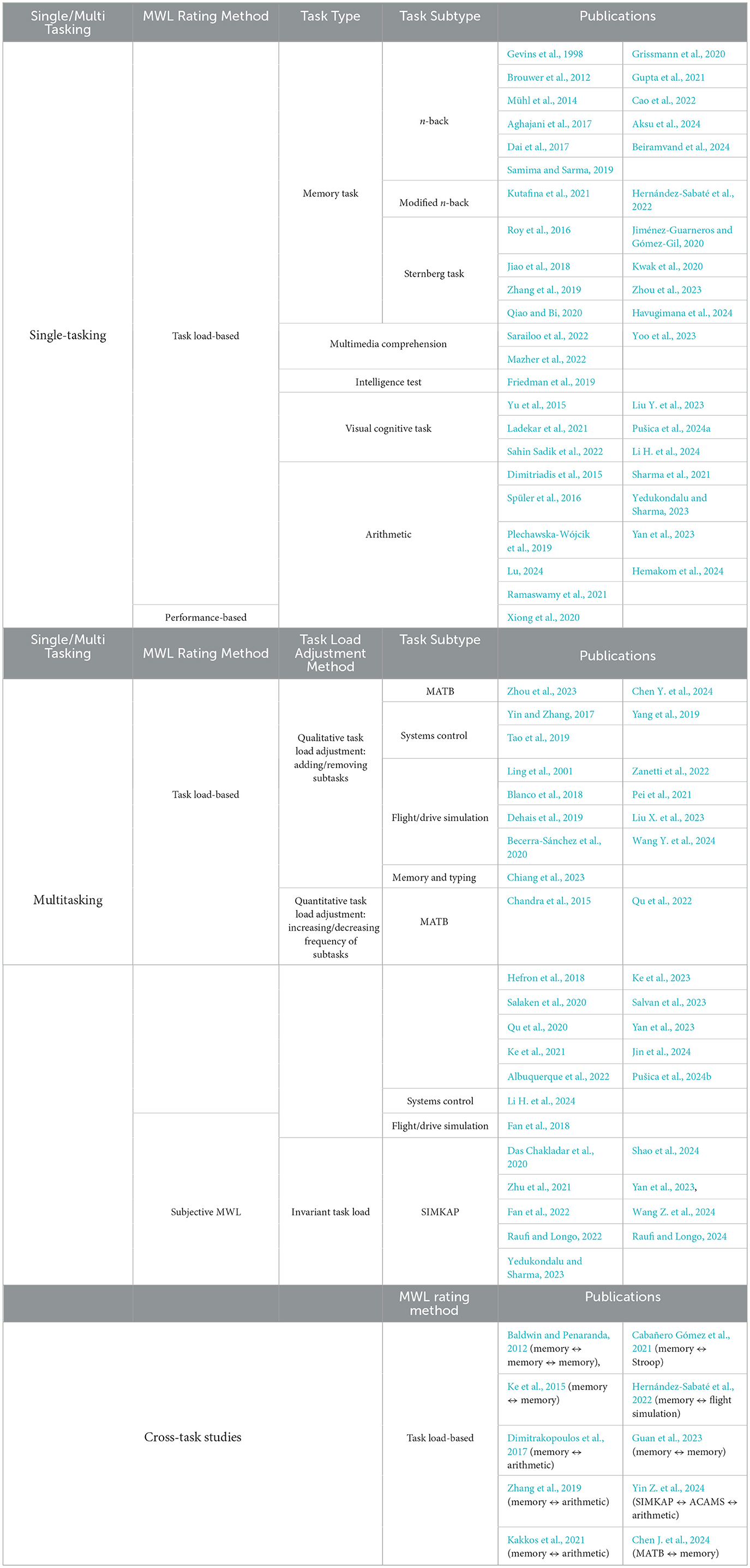 Based on the task type, studies were categorized into two big groups: single-tasking and multitasking. Additionally, a third category was included to analyze papers that examined cross-task MWL estimation—training models on one task and evaluating them on different tasks.
